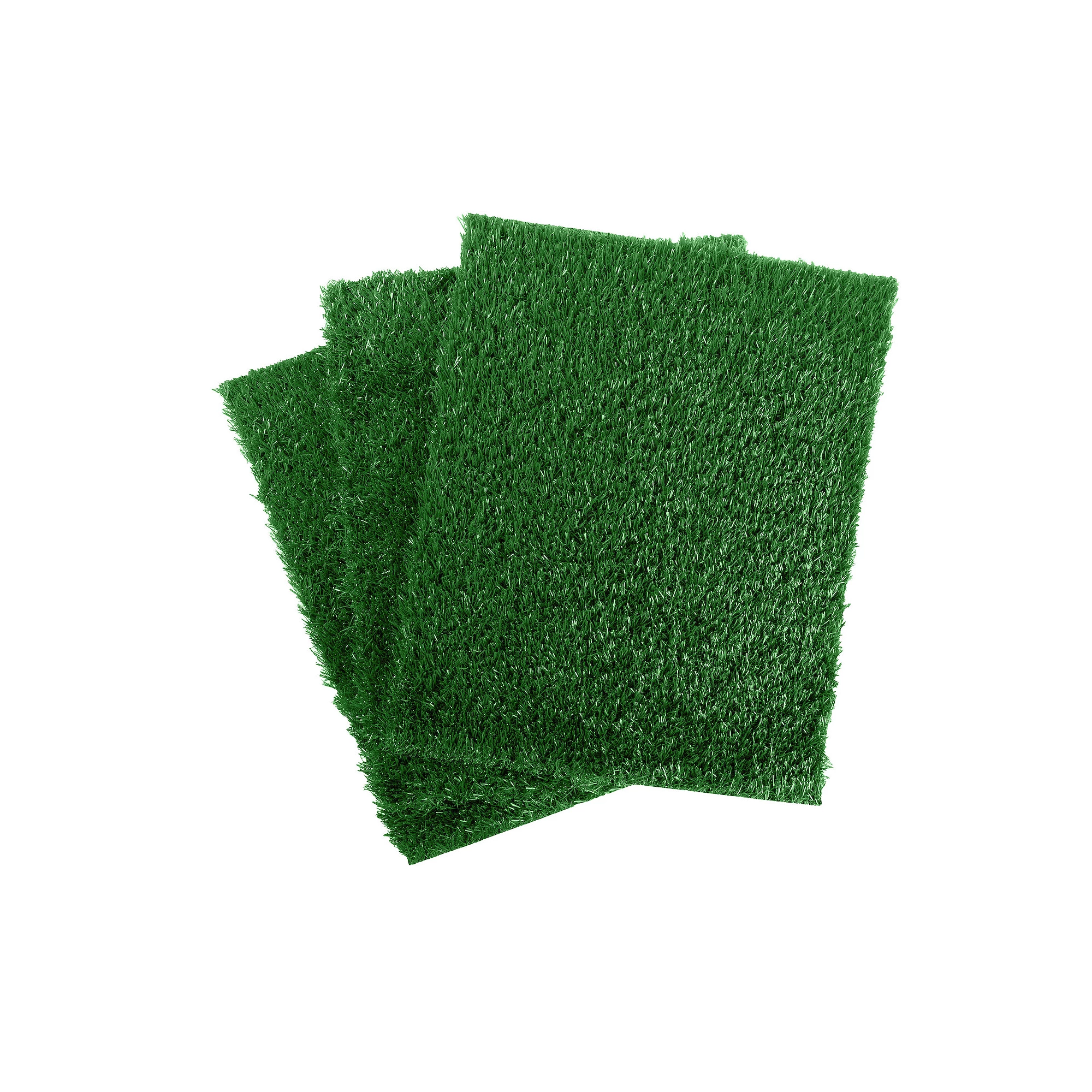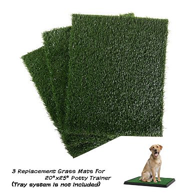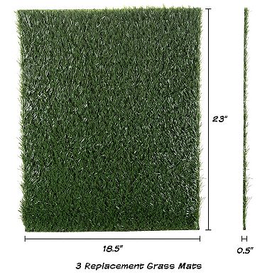 Pet Adobe Puppy Artificial Grass Replacement Mats help prevent stained carpets, soiled furniture, and messes at home and on balconies, porches, patios, and even in RVs or office spaces. This set of three synthetic replacement grass mats (23 x 18.5 inches) fits the 20 x 25-inch Pet Adobe Trainer Tray System and acts as the top layer in a 3-layer system. Designed with drainage holes, the grassy texture helps keep solids on top for easy pick up while allowing liquids to drain into the collection tray. The mats are simple to clean with soap and water and rinse afterward.