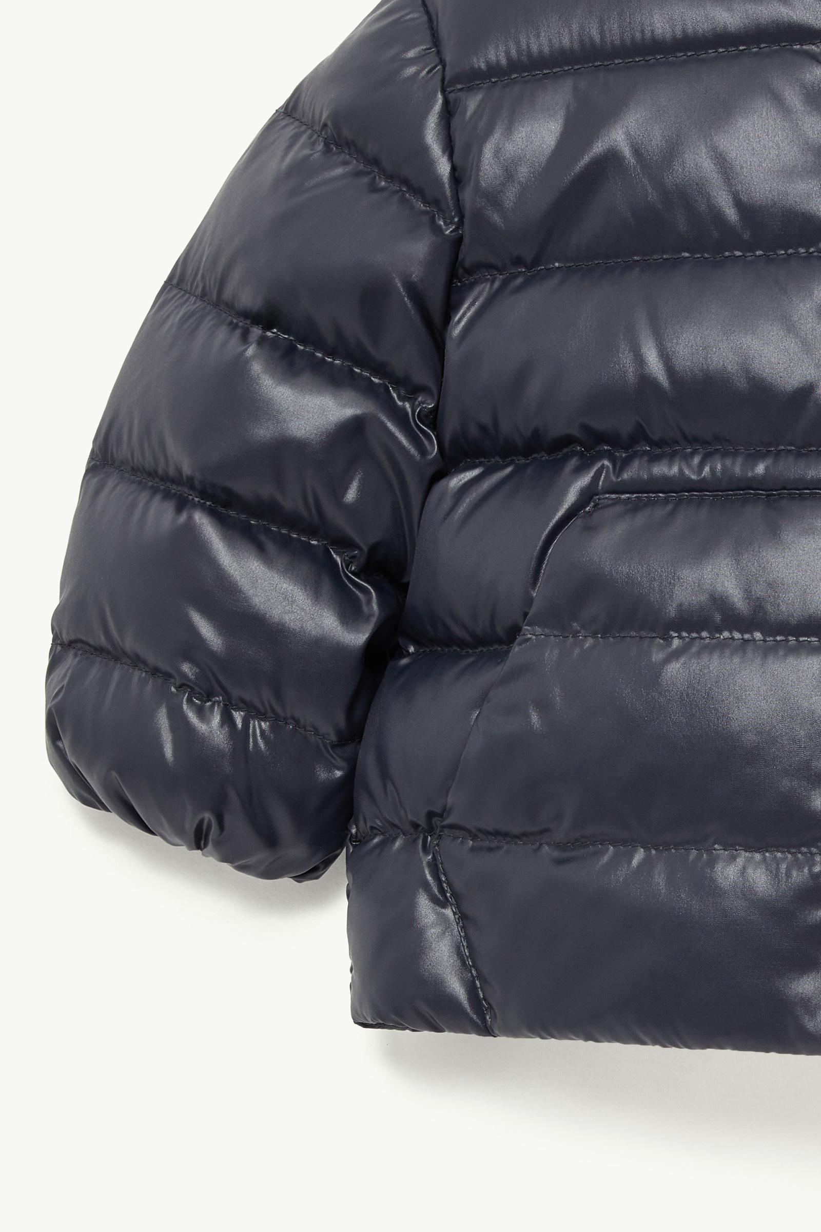 Navy Blue Othoniel Down Jacket for children featuring a lightweight quilted puffer design with a stand collar, front zipper, glossy navy finish, and Moncler logo patch on the lower left sleeve. Unisex with a slightly boxy silhouette, designed for toddlers.
