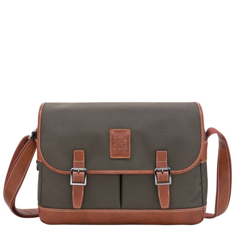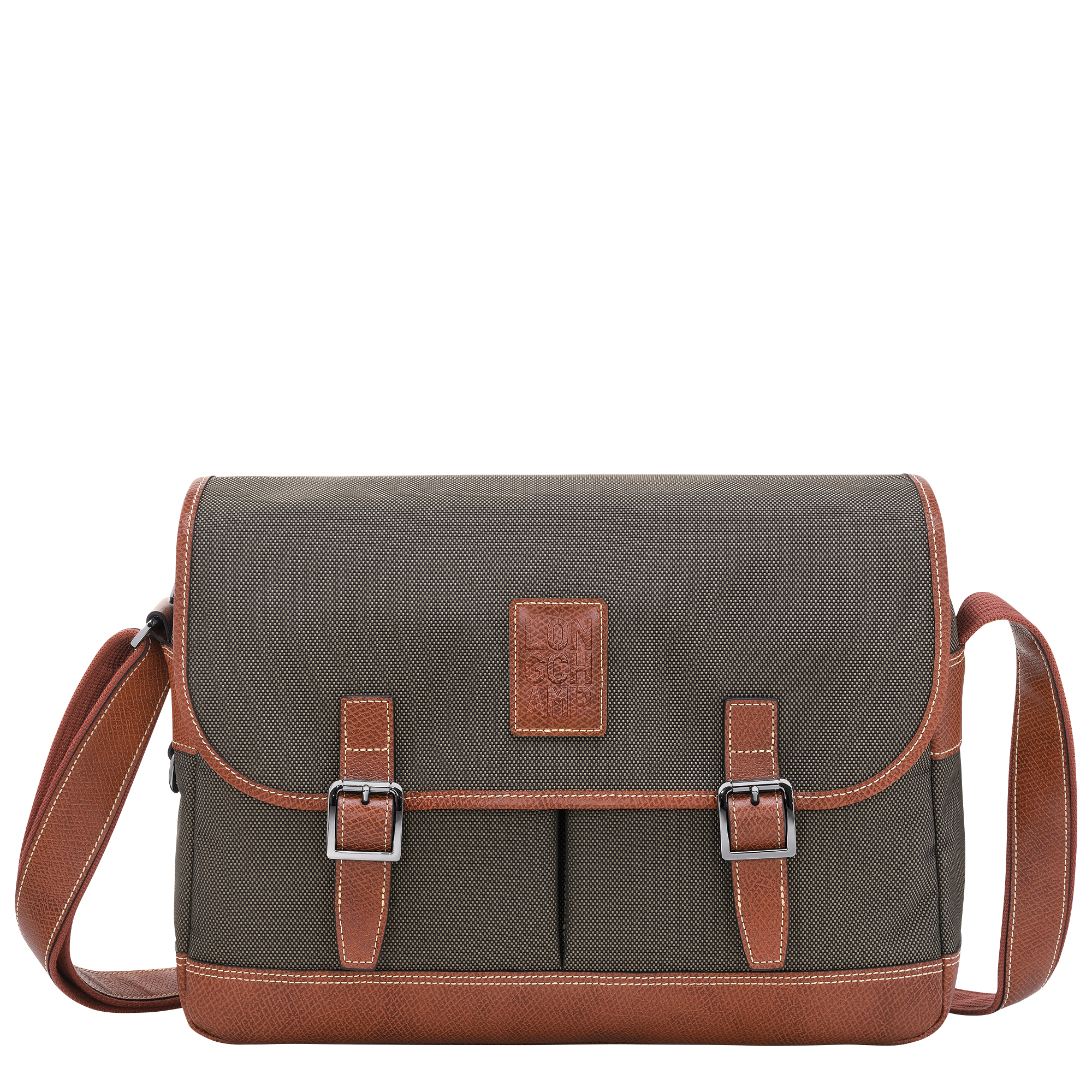 A structured, unisex Boxford L Crossbody bag crafted from recycled canvas with leather trim. Features a wide flap, two buckle straps, and an adjustable shoulder strap. Designed for daily use with internal pockets and laptop/tablet space. Made by Longchamp as part of the Boxford collection, combining rugged canvas with refined leather accents.