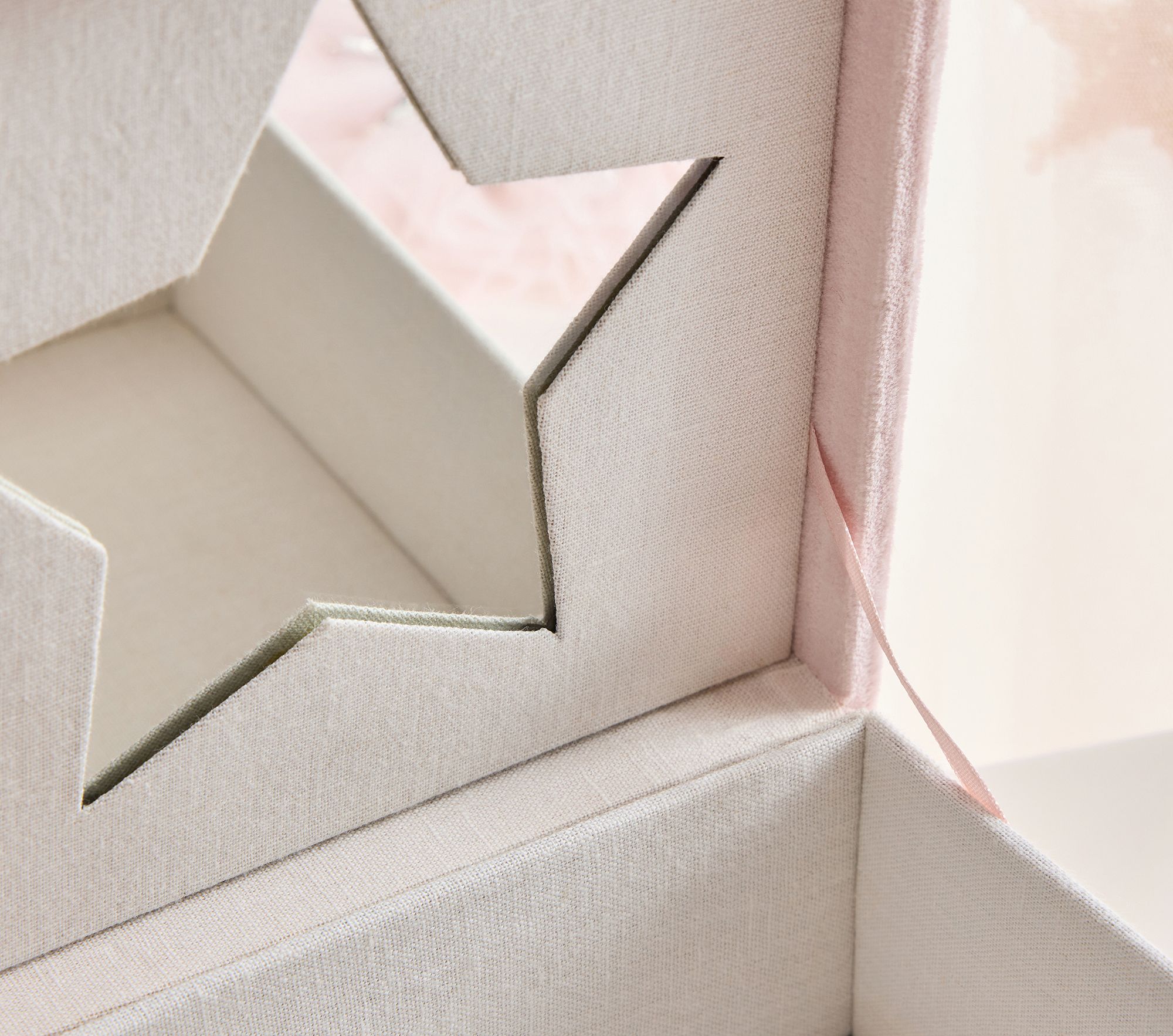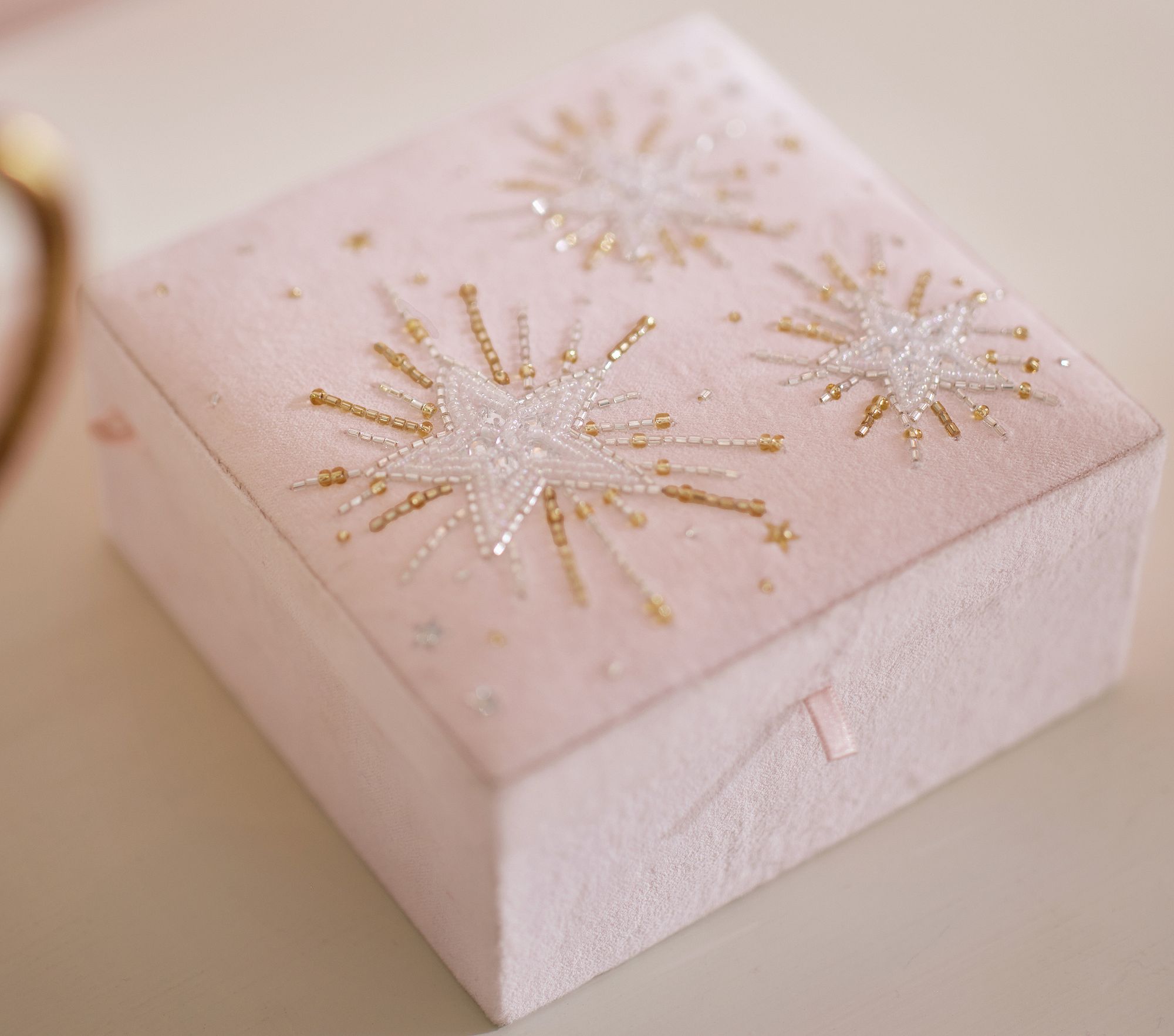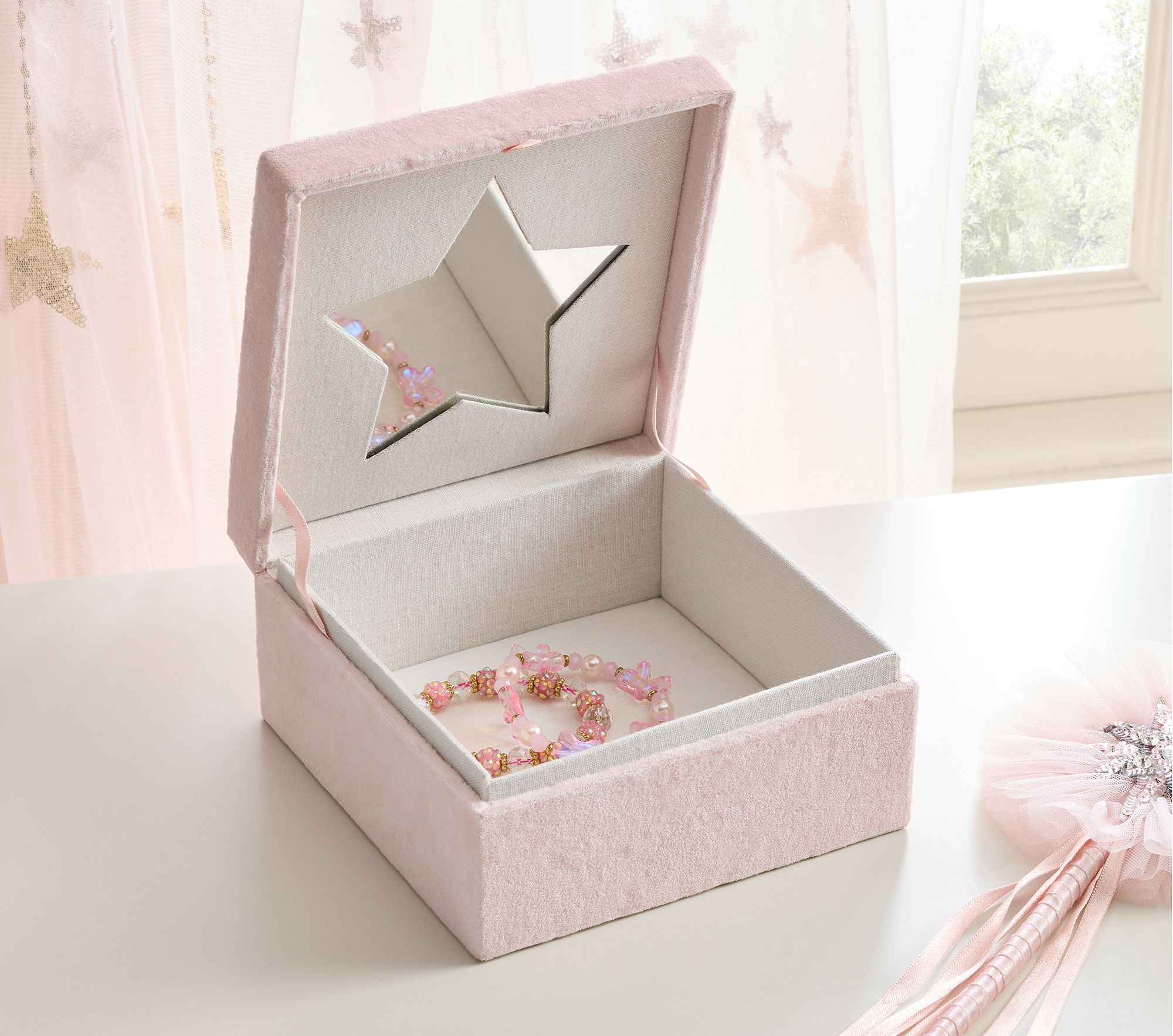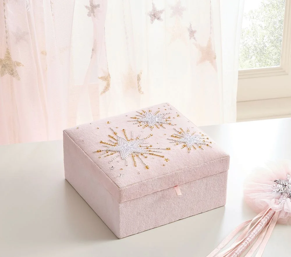 A soft pink velvet jewelry box with a star-shaped mirror inside. Features beaded starburst embroidery on the lid, crafted with velvet exterior and glass beads. Junior-friendly design for kids, exclusive Pottery Barn Kids product inspired by Tutu du Monde.