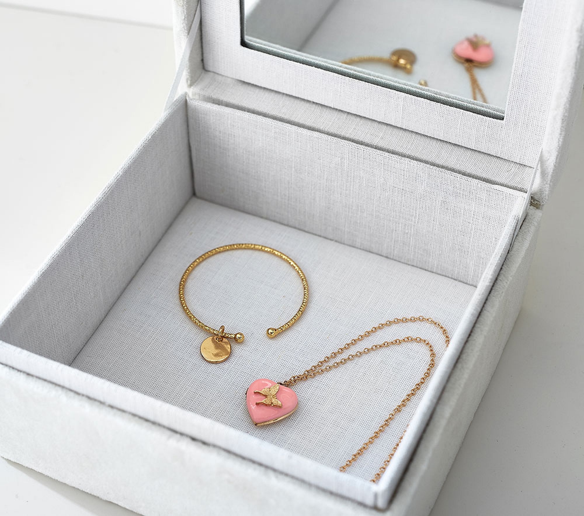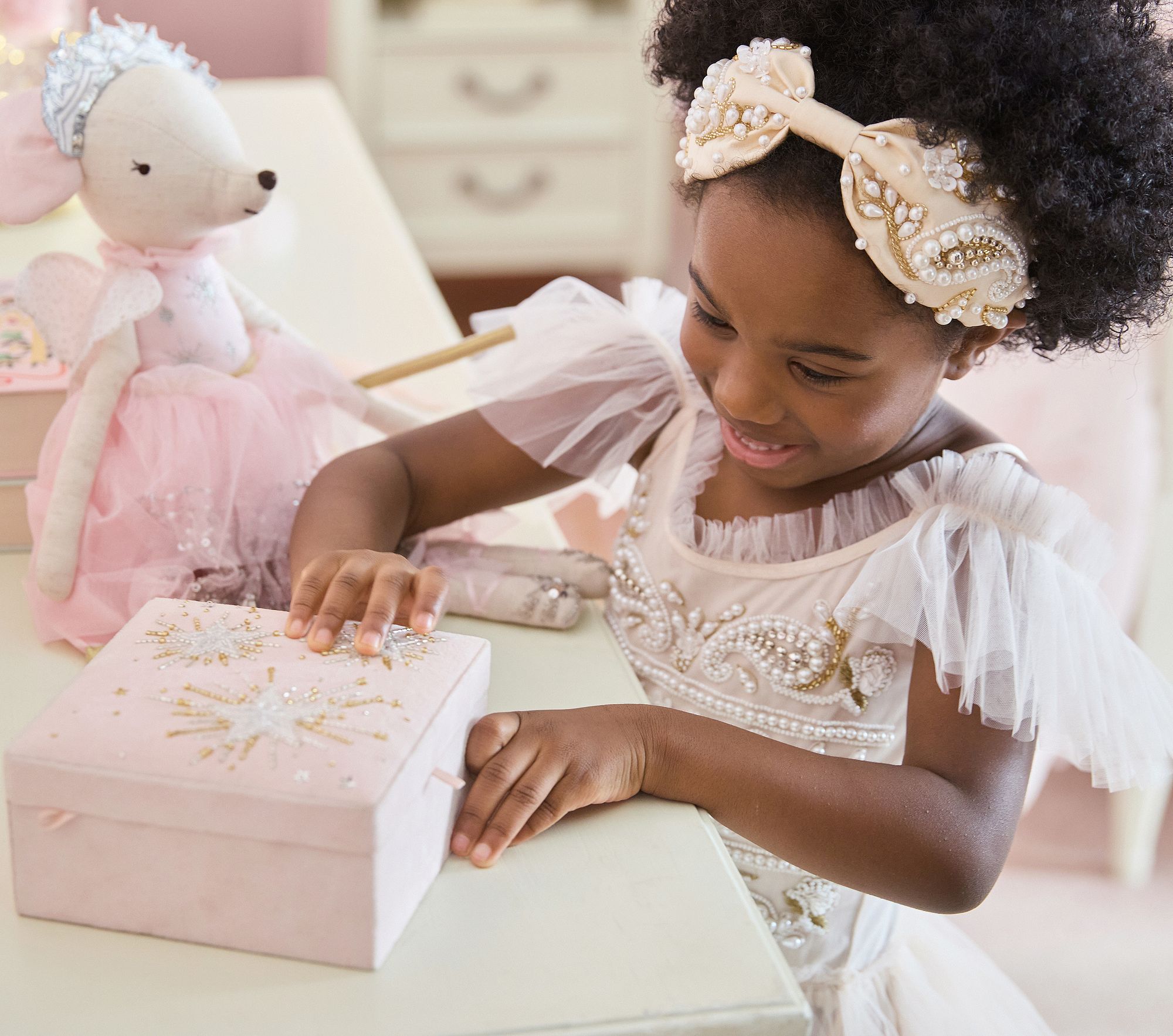 Perfect for a birthday morning reveal, when a child opens the soft pink velvet box to discover beaded sparkle and a starry mirror—merging play with heirloom-worthy craftsmanship.