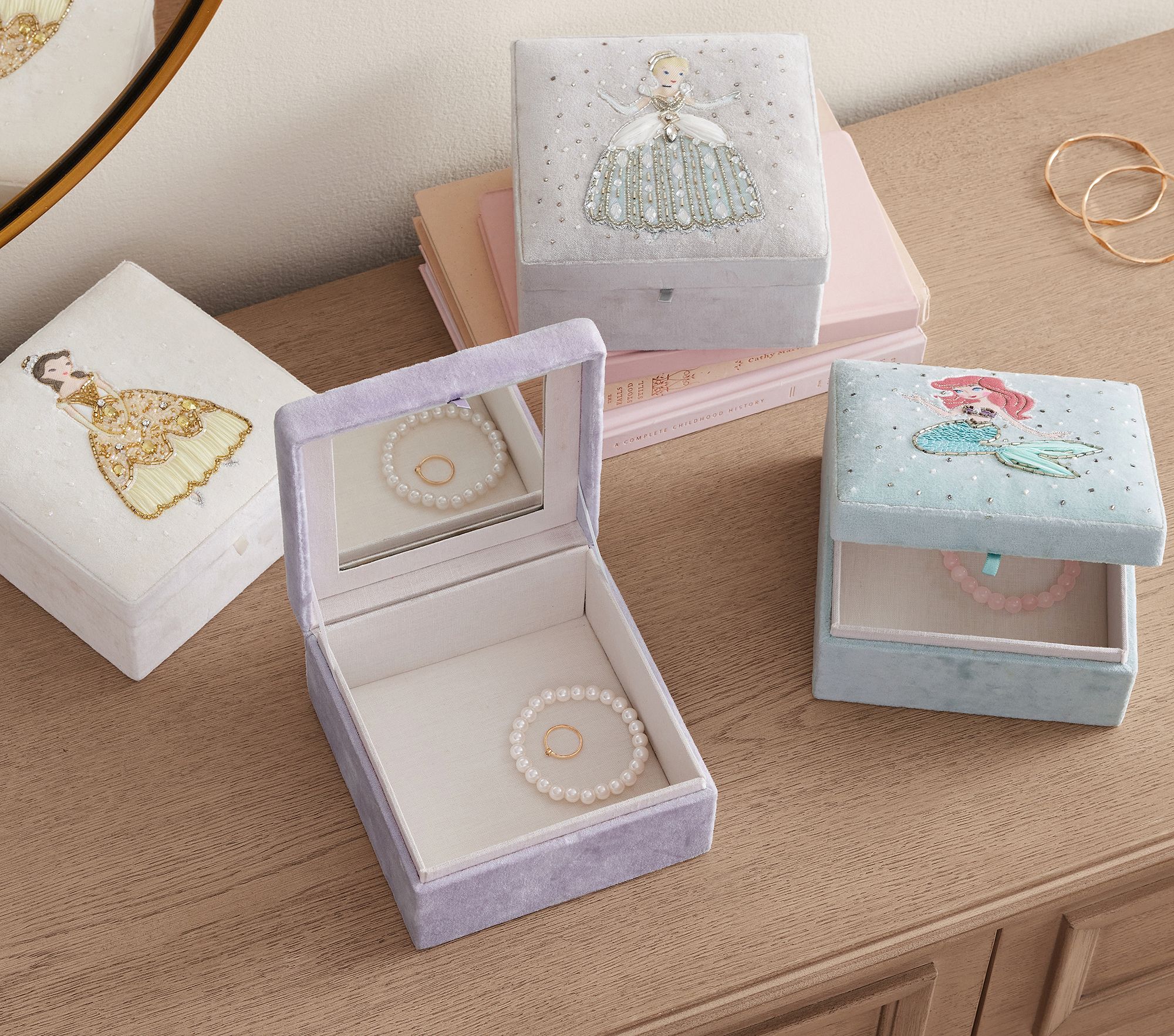 A magical keepsake for sleepy-bedtime jewelry moments—the Ariel-inspired jewelry box becomes a cozy nook for tiny trinkets, while the starburst mirror sparks princess-inspired make-believe after baths.
