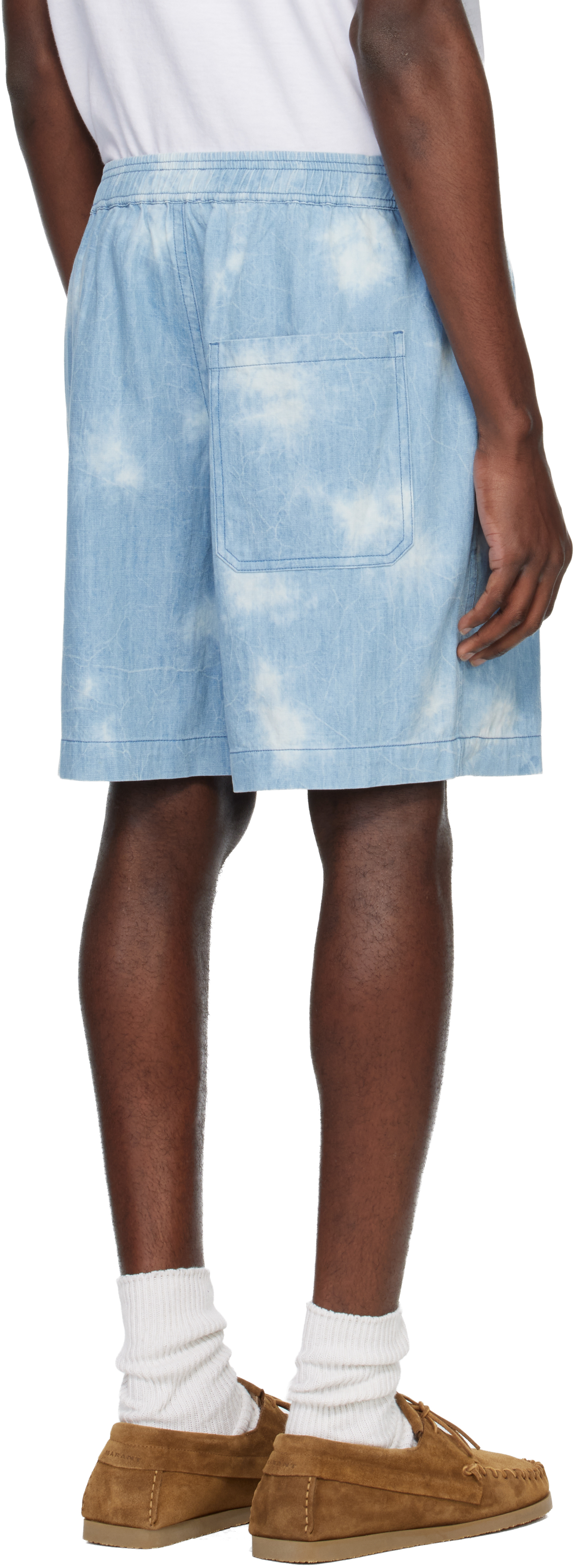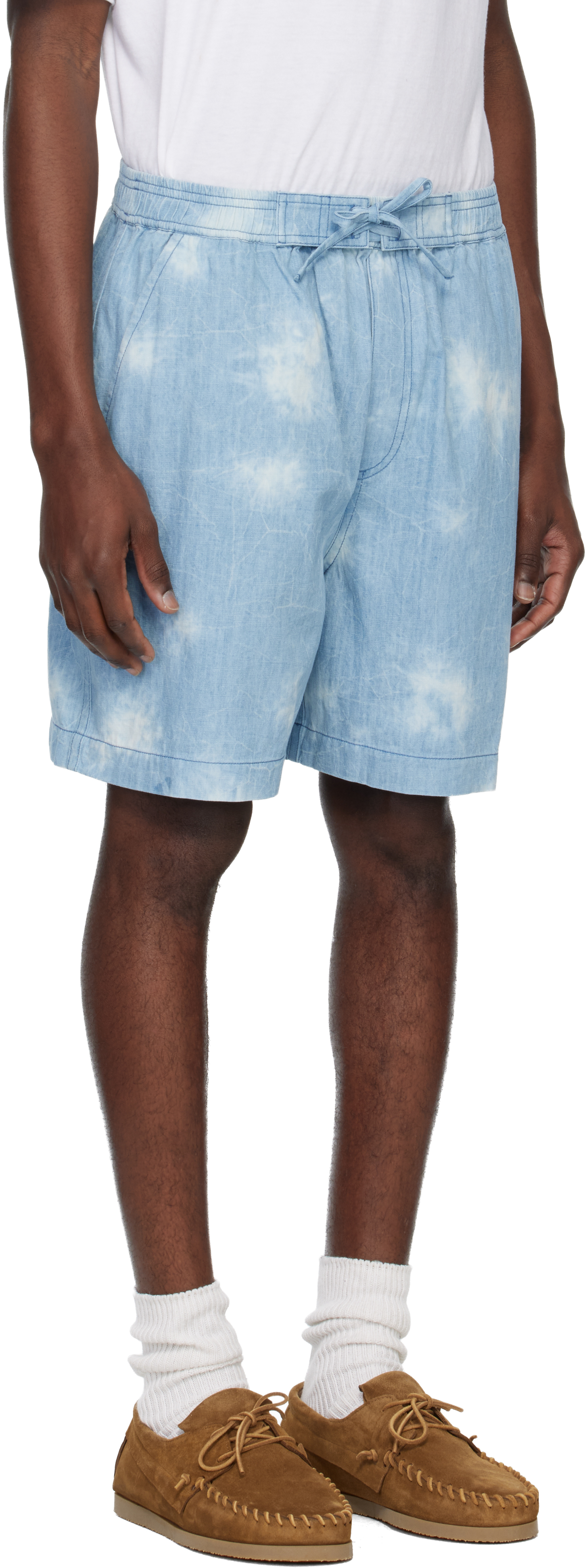 Light blue washed cotton chambray shorts with a drawstring at an elasticated waistband. Designed with belt loops, a mock/button-through fly, and classic three-pocket styling including side-seam pockets and back patch pockets. Knee-length with a straight, hemmed silhouette and subtle fading throughout.
