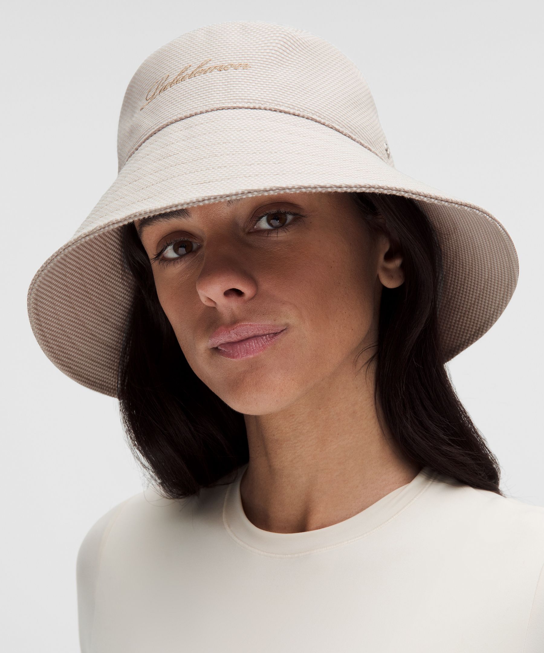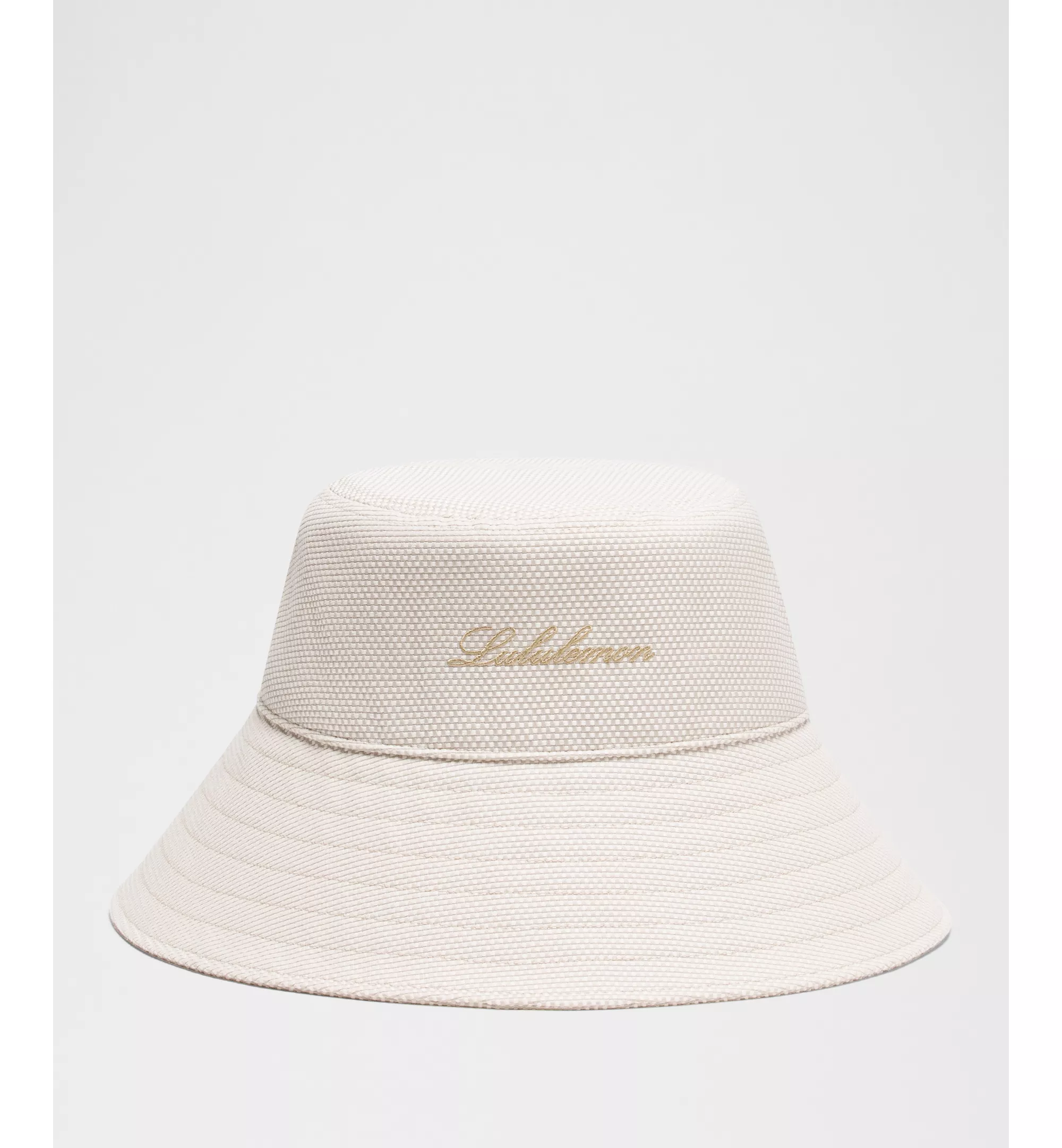 A unisex canvas bucket hat with a wide brim and a subtle two-tone finish. Features a gold-toned embroidered logo on the front crown and a textured weave. Color options include cream and beige tones. Lightweight and sun-protective, designed for all-day wear.