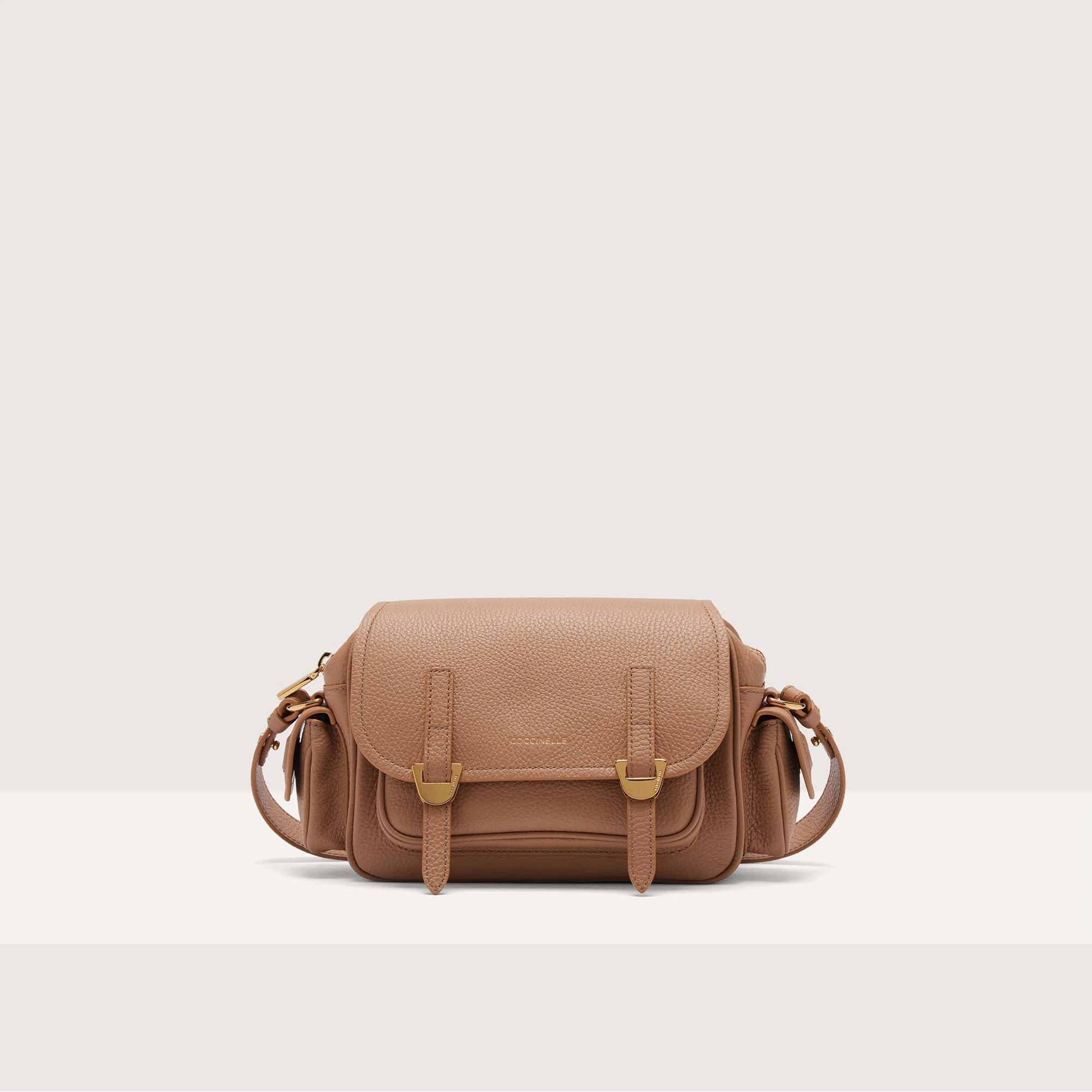 Crossbody bag in pebble-grain leather with flap closure, two vertical belt-like straps with gold-tone buckles, top handle and adjustable shoulder strap. Tan color with gold hardware. Two inner pockets (one with zip), fabric lining. Structured compact silhouette with front under-flap pocket. Made from leather, designed for everyday use with durable finish. Dimensions: 21x15x9 cm. Two-year guarantee.