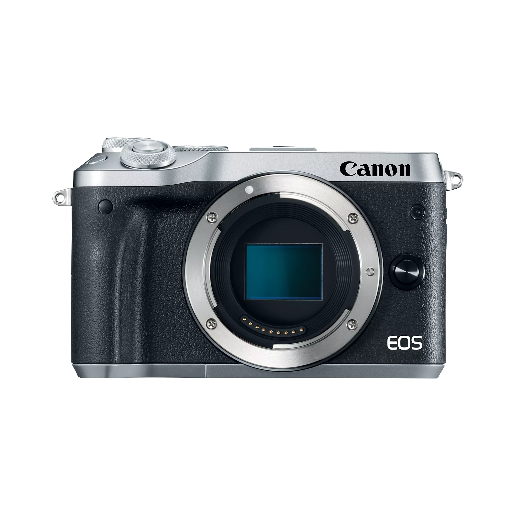 Refurbished EOS M6 Mark II body in silver finish. Mirrorless interchangeable-lens camera body with 32.5 MP APS-C sensor, DIGIC 8, 14 fps, Dual Pixel AF, 4K/Full HD video. Body-only kit includes battery charger, battery, and strap. Out of stock on the PDP.