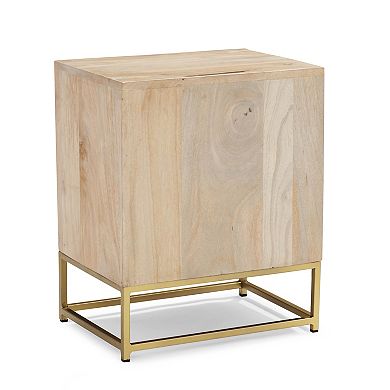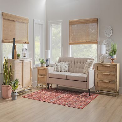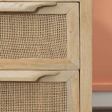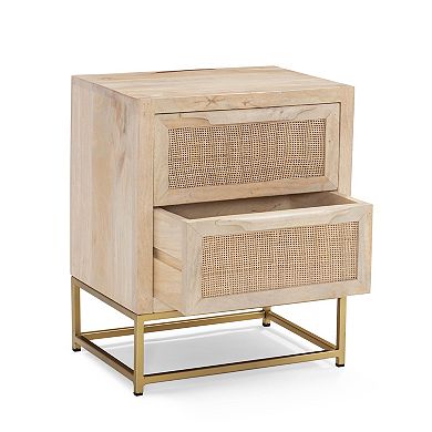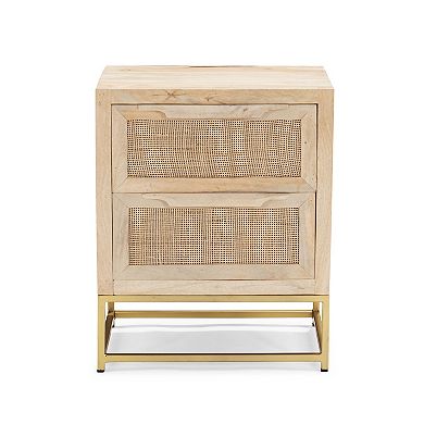 Bring warm, natural texture to your space with the Linon Janie rattan 2-drawer cabinet. It features two stacked drawers with woven rattan/cane fronts framed in light wood and arched pull cutouts. A gold/brass-tone open-frame metal base elevates the cabinet for an airy, modern look—perfect for indoor storage in any room.