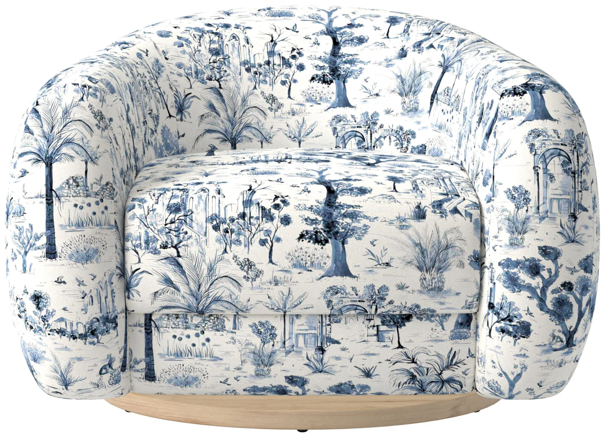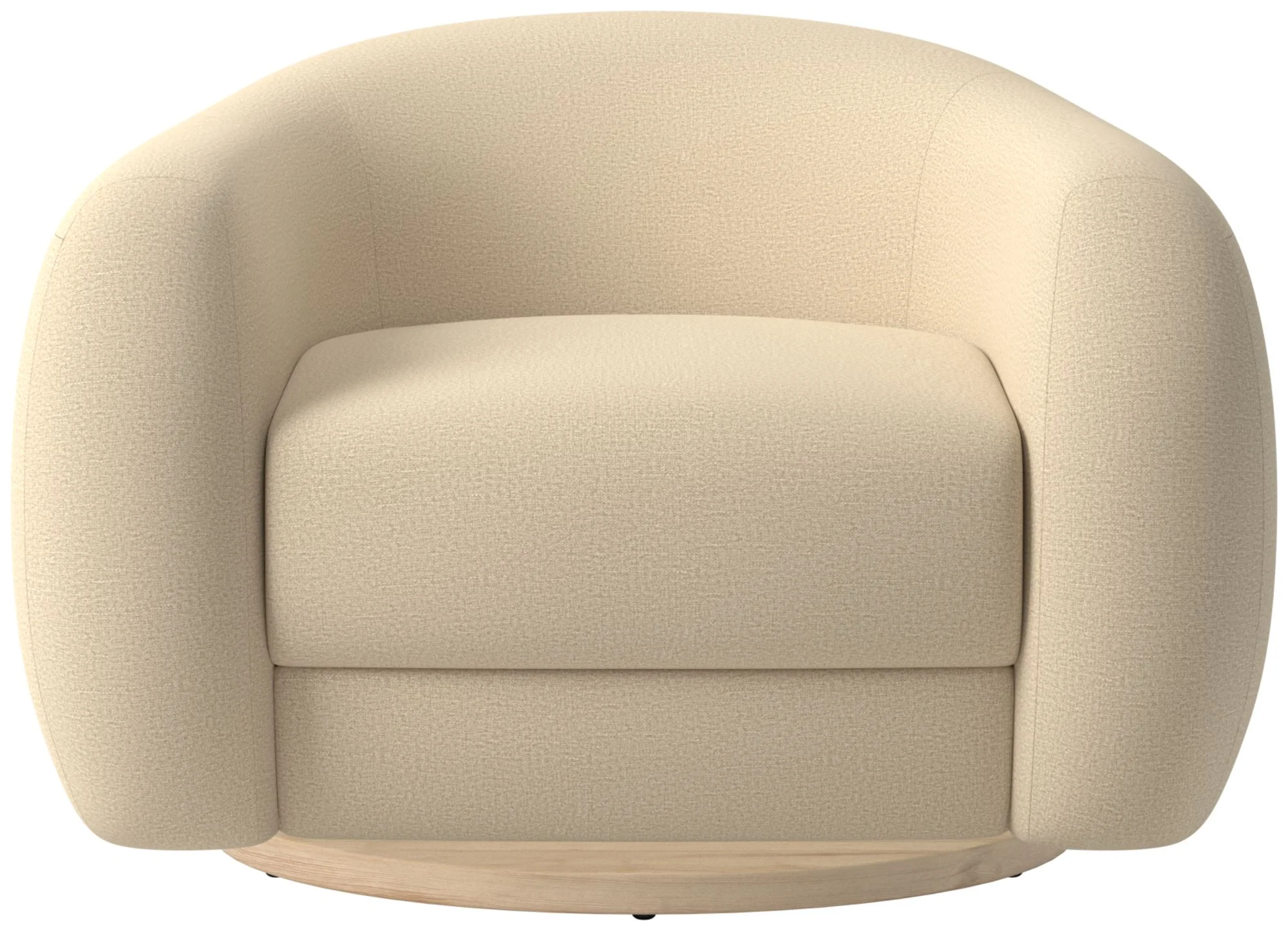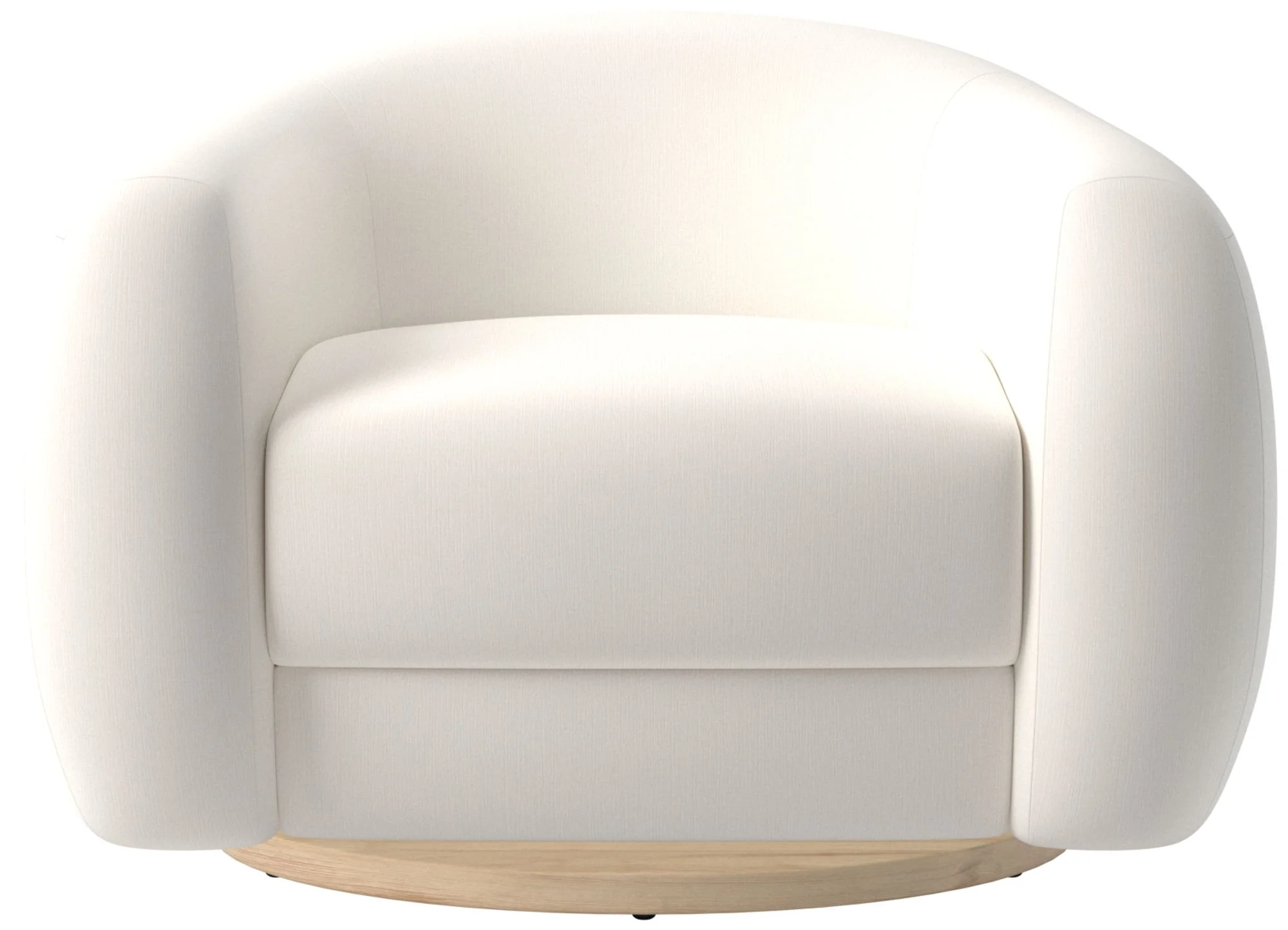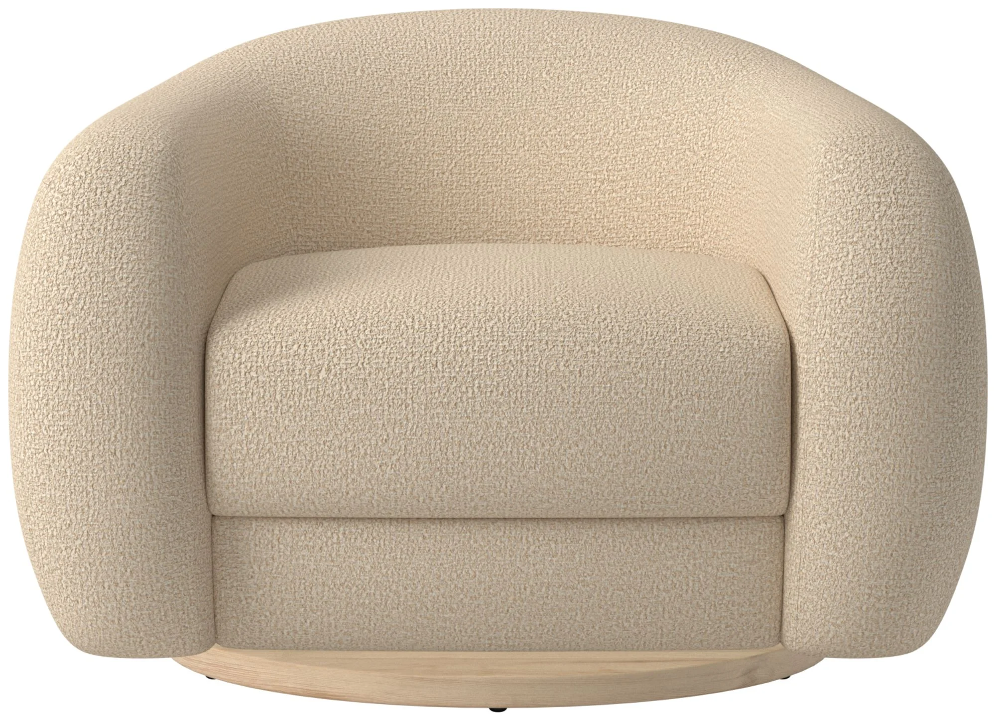 A luxurious, modern swivel chair with a cocoon-like silhouette and cloud-like bouclé upholstery. Features a rounded back and integrated arms, foam-wrapped seat with feathers and polyester, and a natural oak swivel base. Designed by Ross Cassidy for CB2. CB2 exclusive collection. Made with engineered wood frame and FSC certification; fabric varies by selection. Care: blot spills, avoid abrasive cleaners; color may fade in direct sunlight.