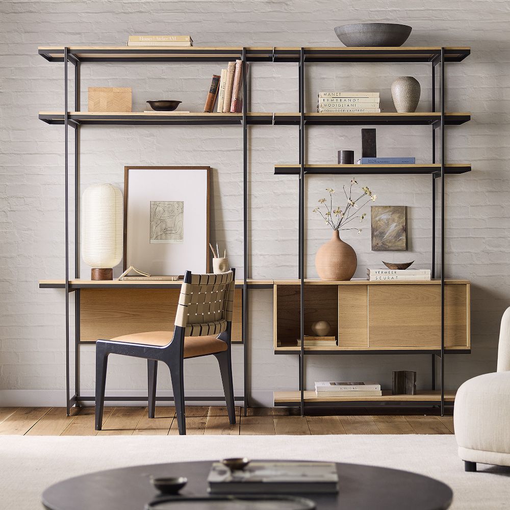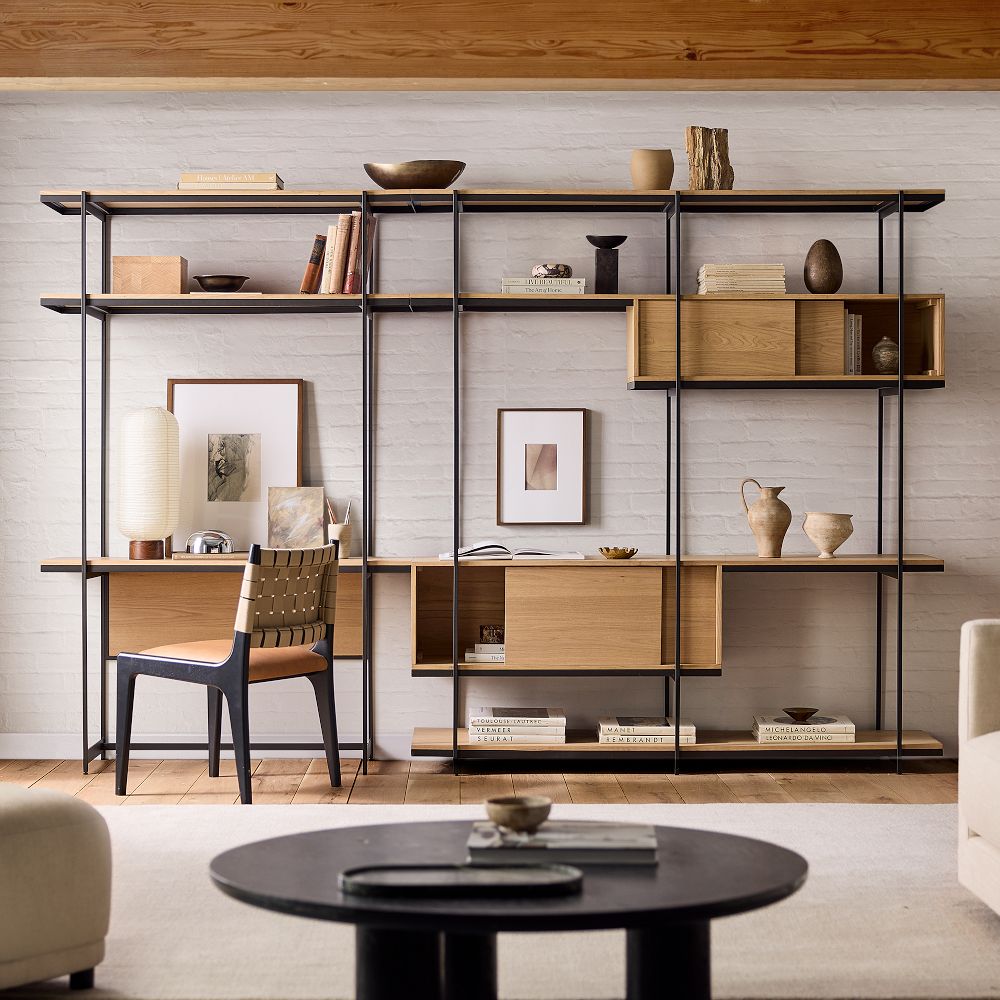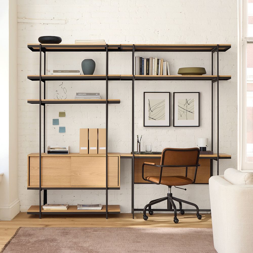 In a shared office or coworking space, the Build Your Own Pierce pieces slot into a corner like a built-in with a slim metal frame that doesn’t crowd the room, making it easy to add storage without sacrificing floor space.