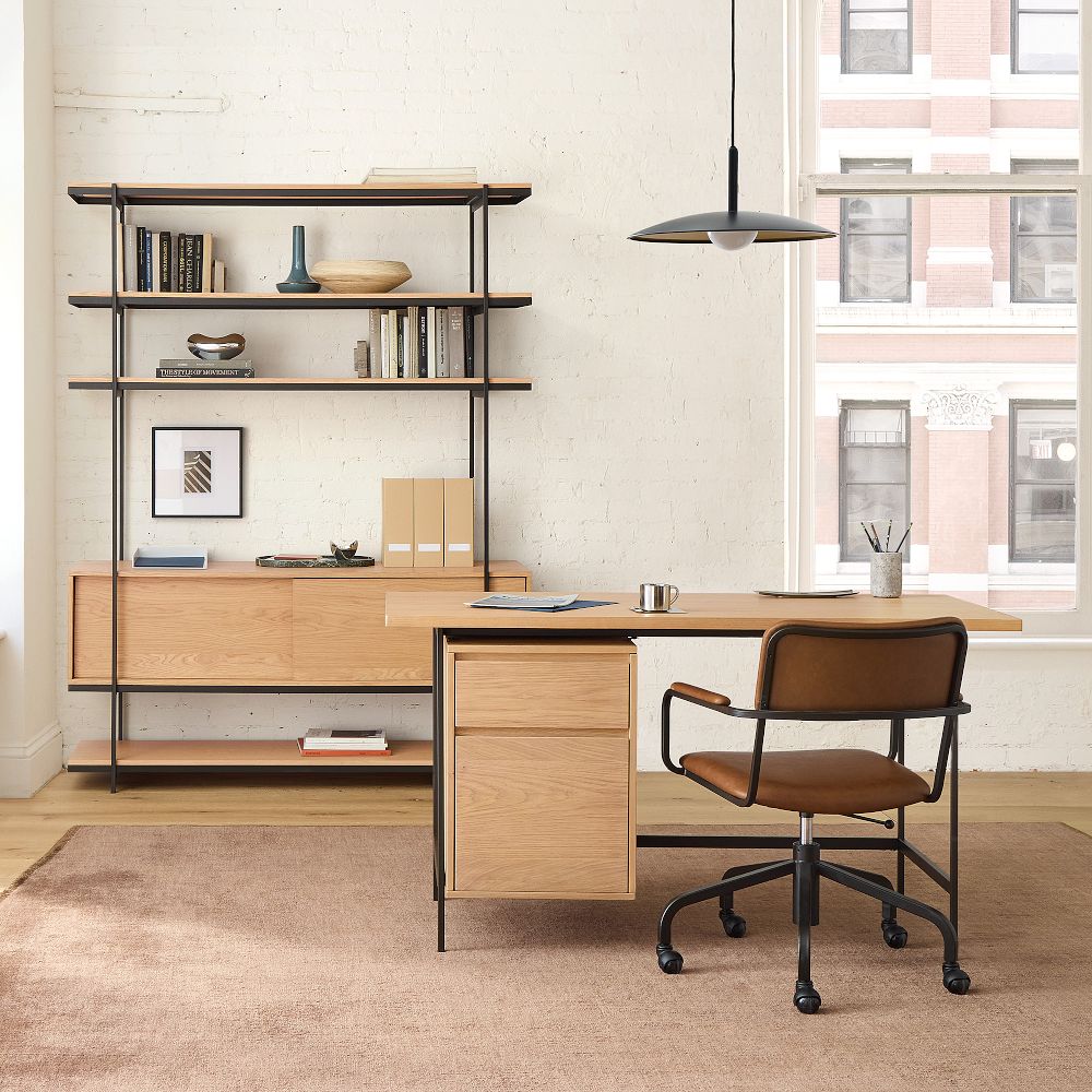 For a design-forward home office, you can pair the blonde oak veneer desk with the dark metal accents to create a mid-century modern vibe that reads polished, not utilitarian, even during client calls.