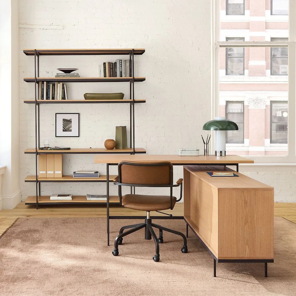 "Mid-century office perfection that pairs contract-grade durability with warm, approachable finishes for home or workspace."