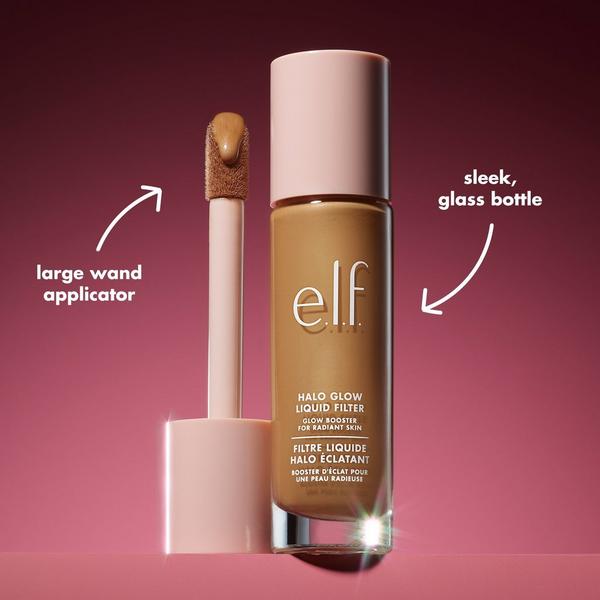 Achieve a radiant, soft-focus finish with the e.l.f. Halo Glow Liquid Filter. This versatile complexion booster is a makeup-skincare hybrid formulated with skin-loving ingredients like Squalane and Hyaluronic Acid to hydrate and enhance the skin's natural radiance. It can be worn alone for a subtle glow, under or over makeup for a dewy look, mixed with foundation, or used as a targeted highlighter. This specific product is shade 4 Medium and comes in a recyclable glass container, reflecting e.l.f.'s commitment to being 100% vegan, cruelty-free, and Leaping Bunny Certified. It is suitable for all skin types.