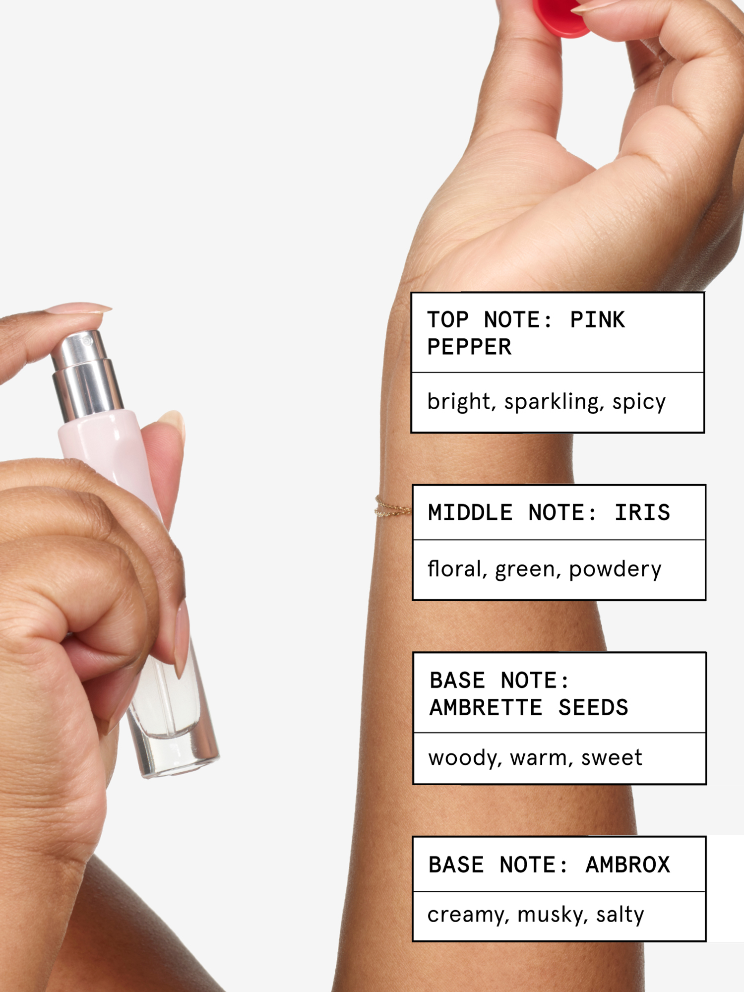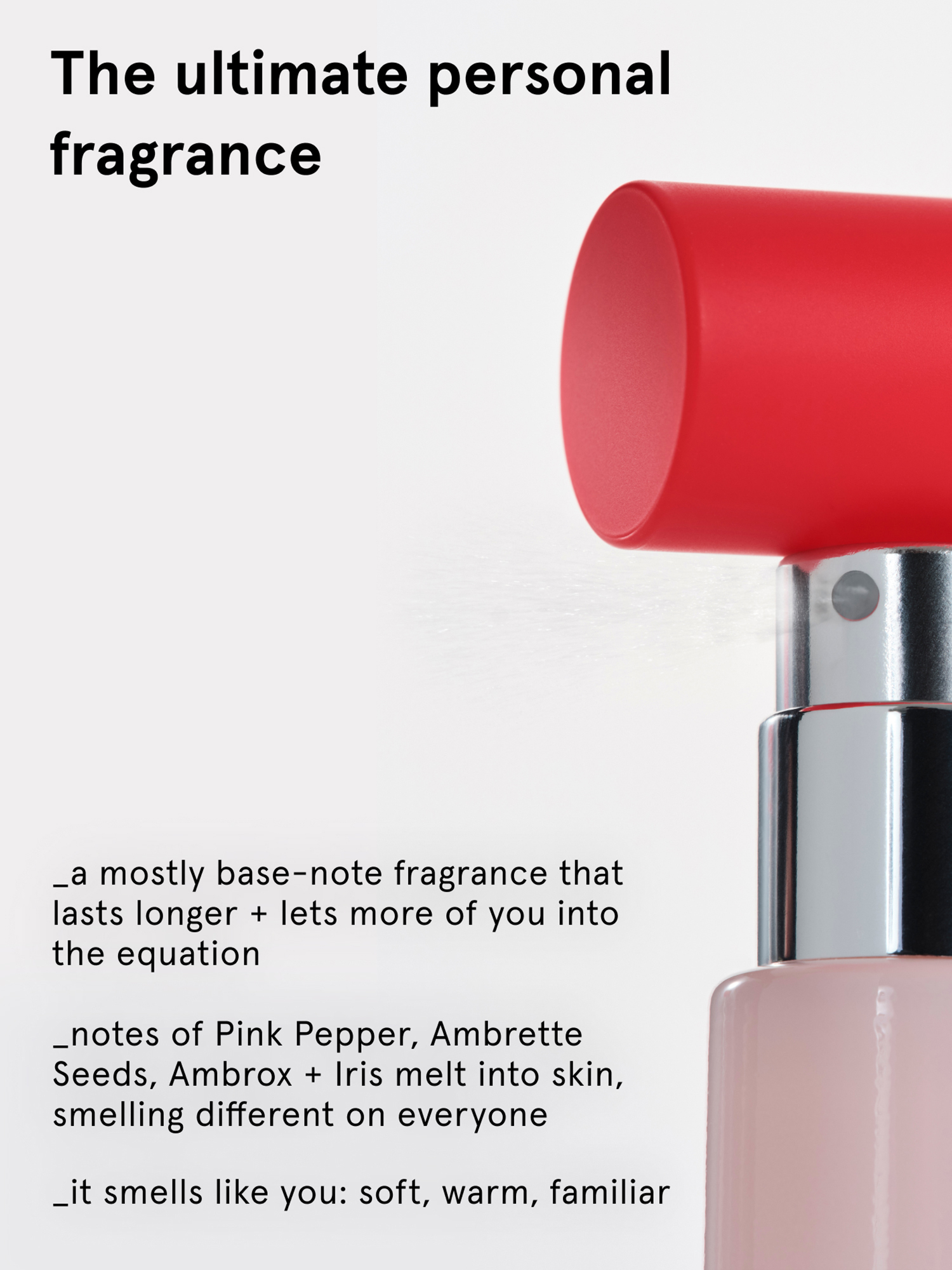 - •Signature notes that adapt - Pink Pepper (top), Iris (heart), Ambrette + Ambrox (base) provide a refined, cozy scent that stays close to the skin.