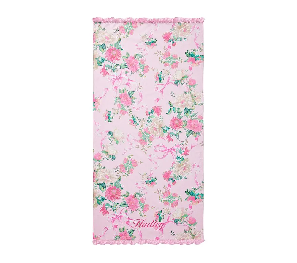 A charming, hooded beach towel designed for children, featuring a delicate floral and ribbon pattern on a light pink background. It has ruffled edges for an extra feminine touch and provides UPF 50+ sun protection, making it perfect for beach days. This specific item is personalized with the name 'Hadley'.