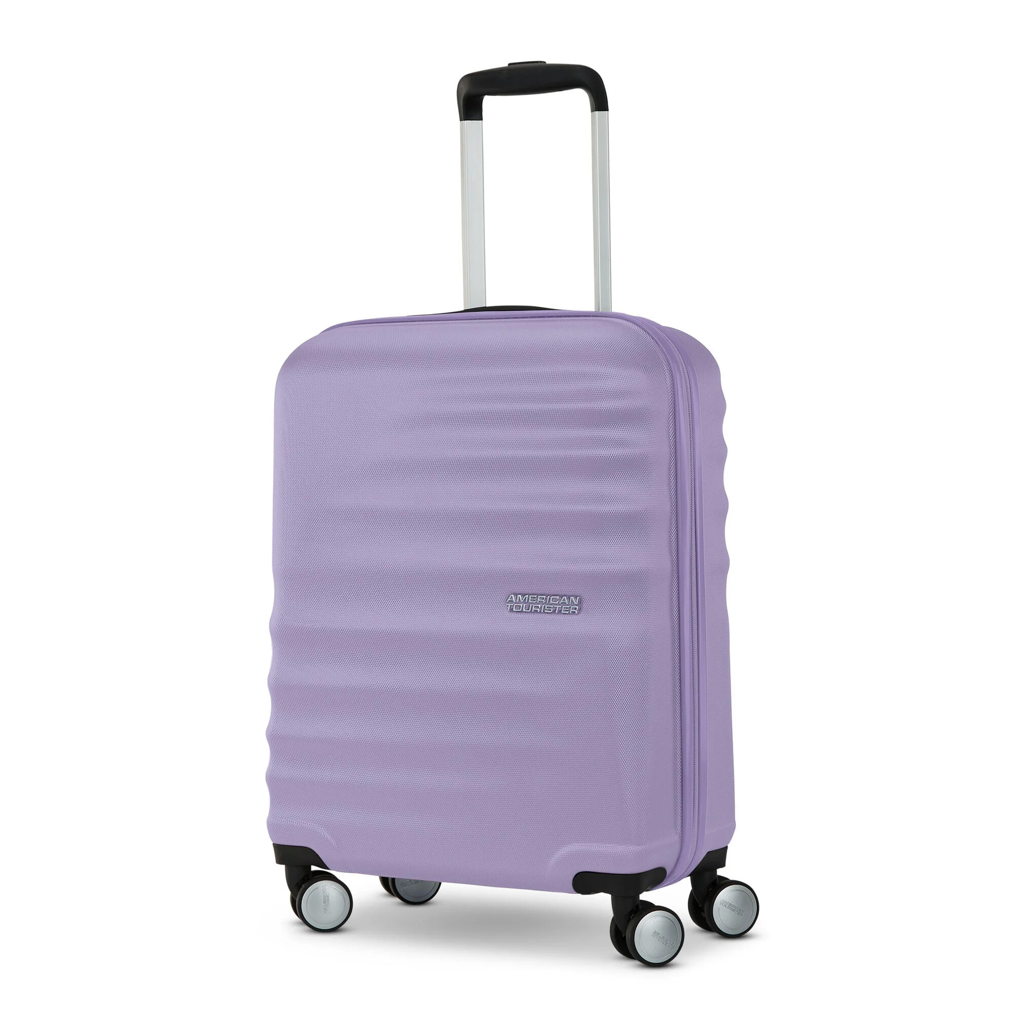 Wavebreaker Carry-On Spinner is a hard-side carry-on luggage with ABS scratch-resistant texture, four dual-wheel spinners, a telescoping handle with a TPR-coated grip, and interior organization features including cross-ribbons and a zippered divider. It is designed for short trips and frequent travel and comes in multiple lavender/purple color options.