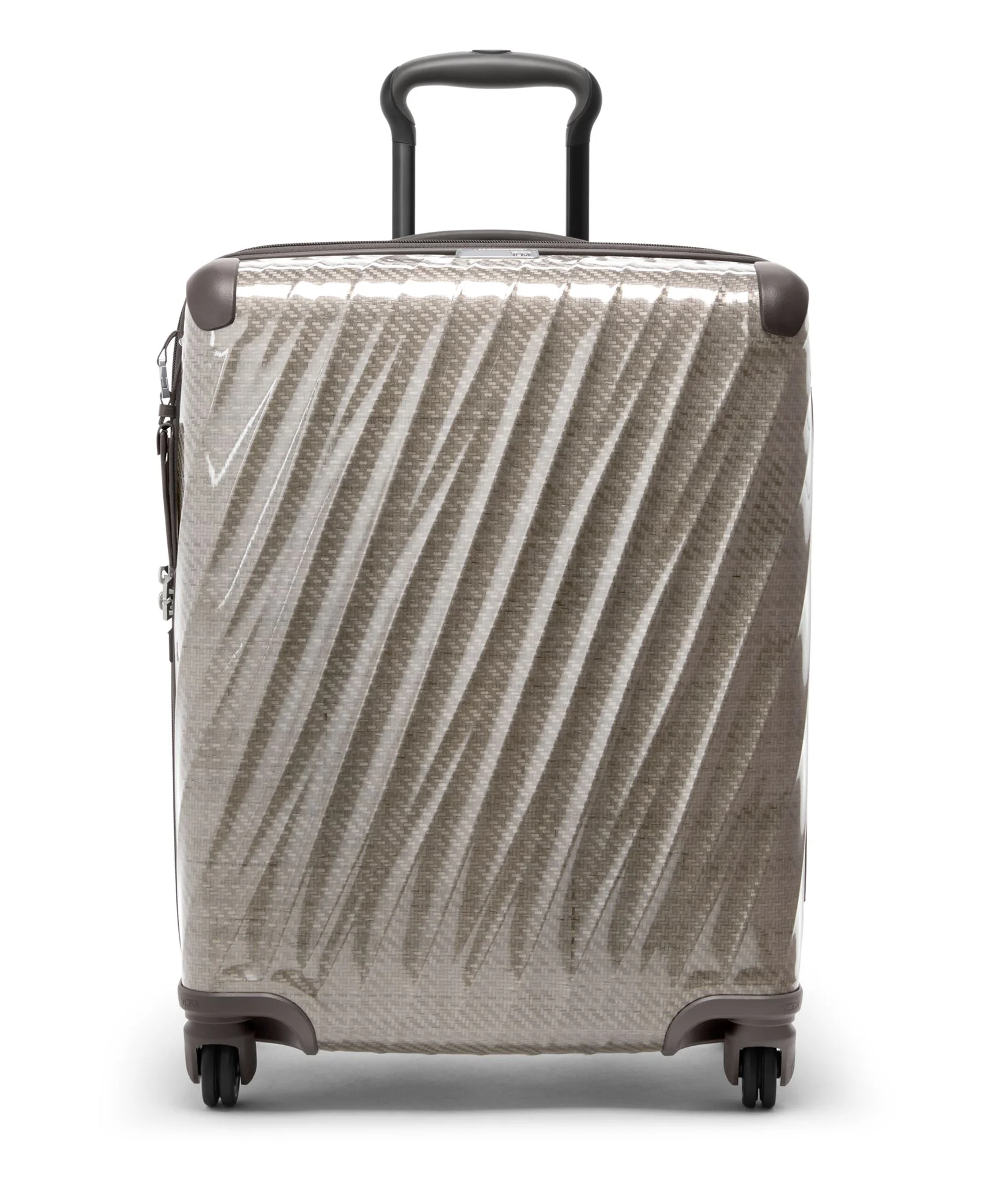 Unisex adult hard-shell carry-on with Tegris shell, lightweight 19 Degree Lite design. Features include four dual wheels, magnesium 3-stage telescoping handle, reinforced corners, interior with multiple pockets and diagonal zip divider, TUMI Tracer, and a monogram option. Previously known as Continental 4 Wheeled Carry-On.