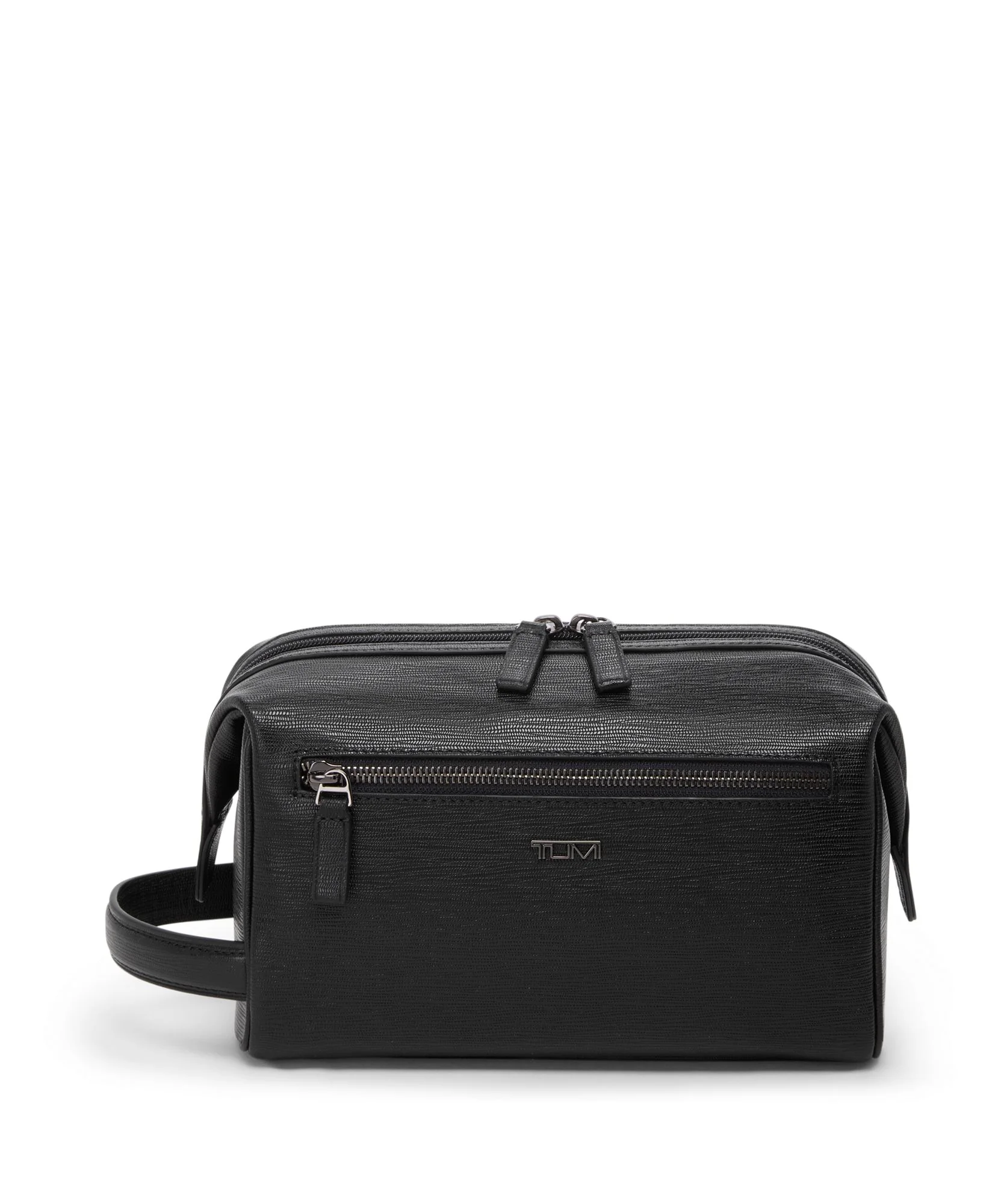 A compact framed travel kit in black leather with a top zipper, front pocket, retractable side handle, and water-resistant lining. Features include a framed opening for easy access, TUMI Tracer, and antimicrobial lining for protection. Includes monogram options and embossed patch branding.