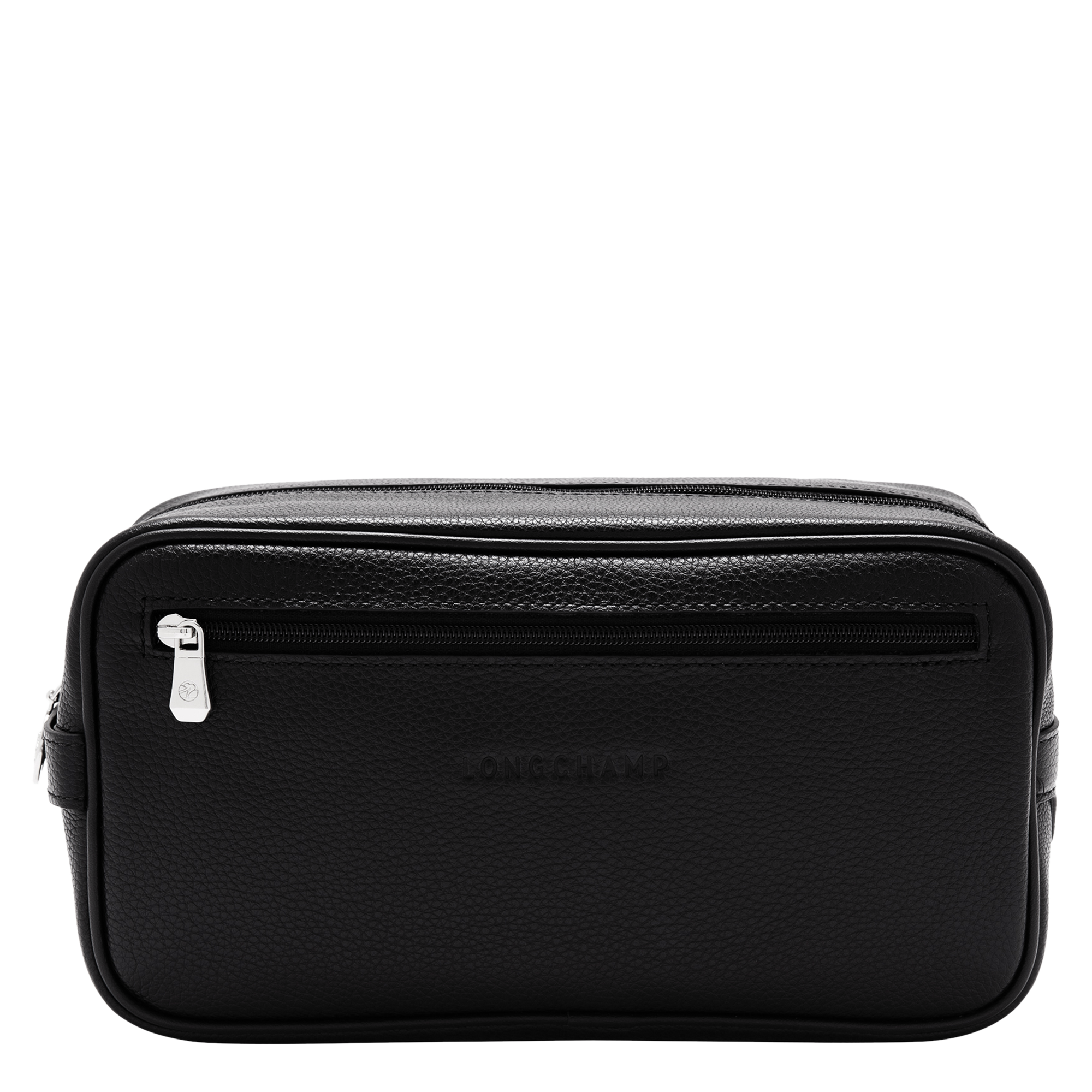"Compact, unisex toiletry case in pebble leather that blends Parisian craft with durable, everyday practicality."
