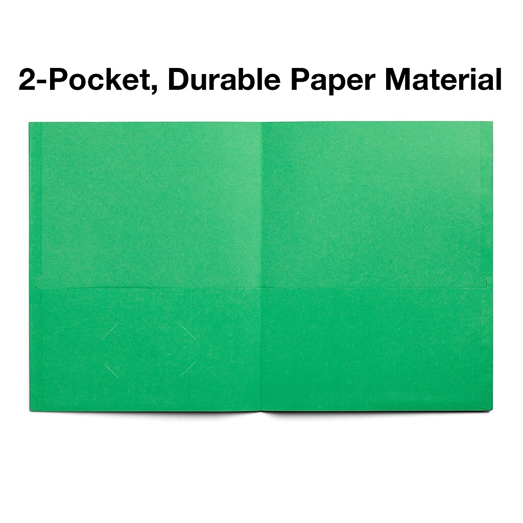 During a quarterly client brief, you drop in the stapled deck in a crisp green 2-pocket folder to keep everything organized and presentable without extra bulk.