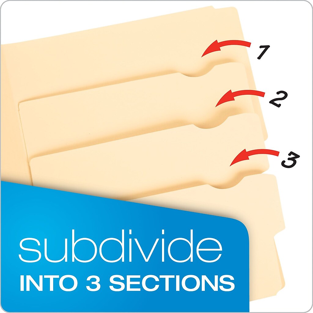 "Pendaflex Divide It Up: trusted, four-tab folders that securely segment your documents by category and subcategory for fast, durable filing."