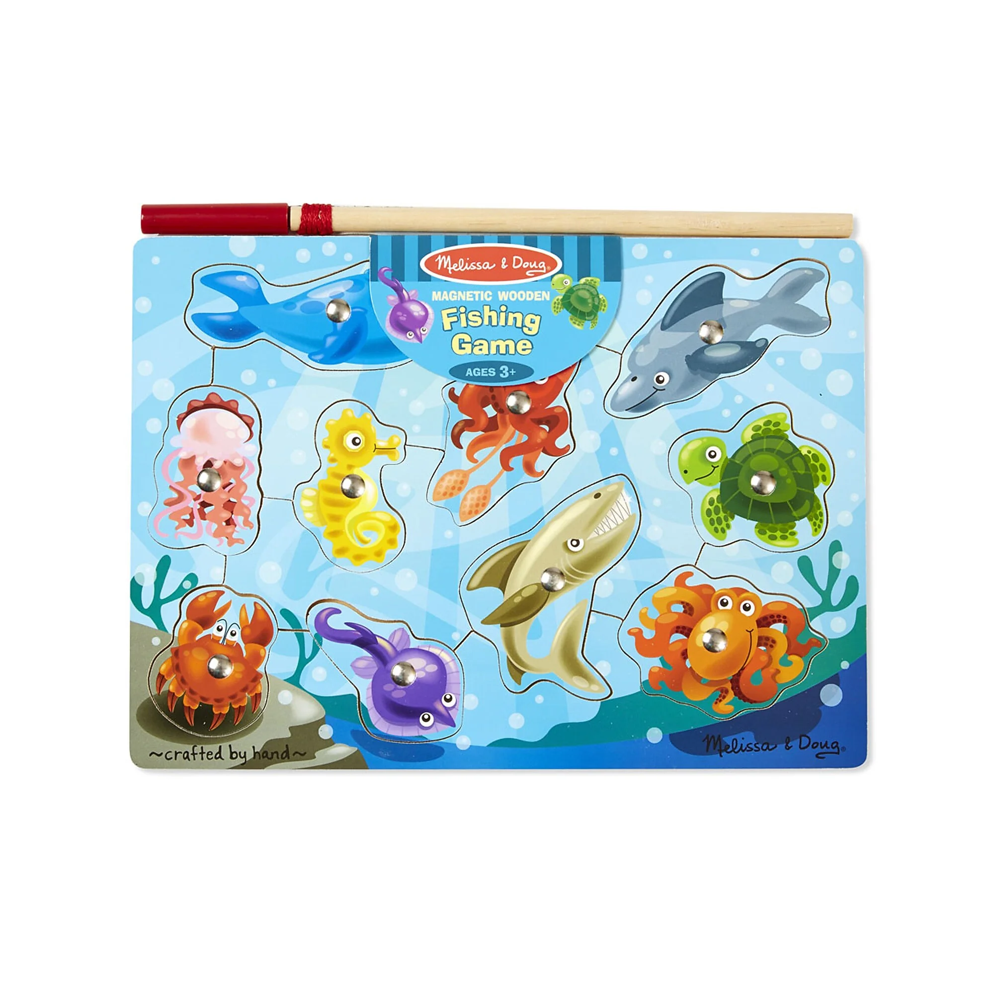 The Melissa & Doug 10-Piece Fishing Game Magnetic Puzzle Game (LCI3778) is a wooden magnetic fishing board themed around an underwater scene. It includes a magnetic fishing pole and ten colorful sea creatures with magnets to hook and release from the board. Suitable for ages 3 and up, it encourages eye-hand coordination and fine motor development.
