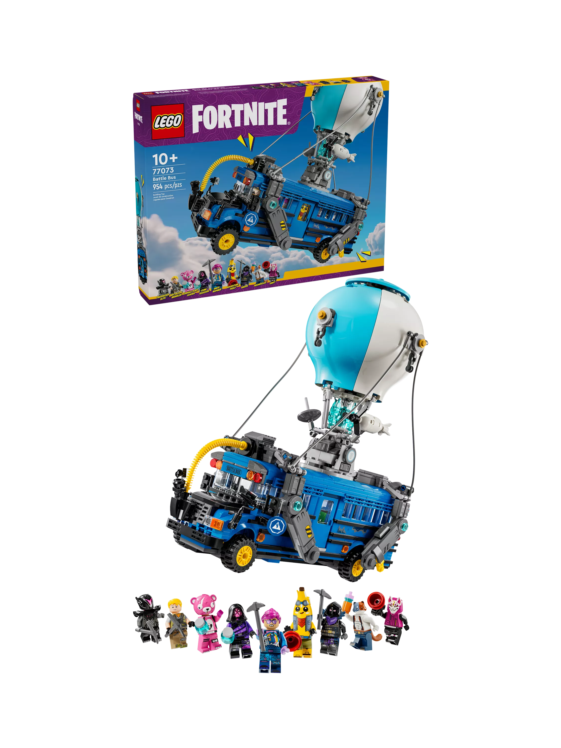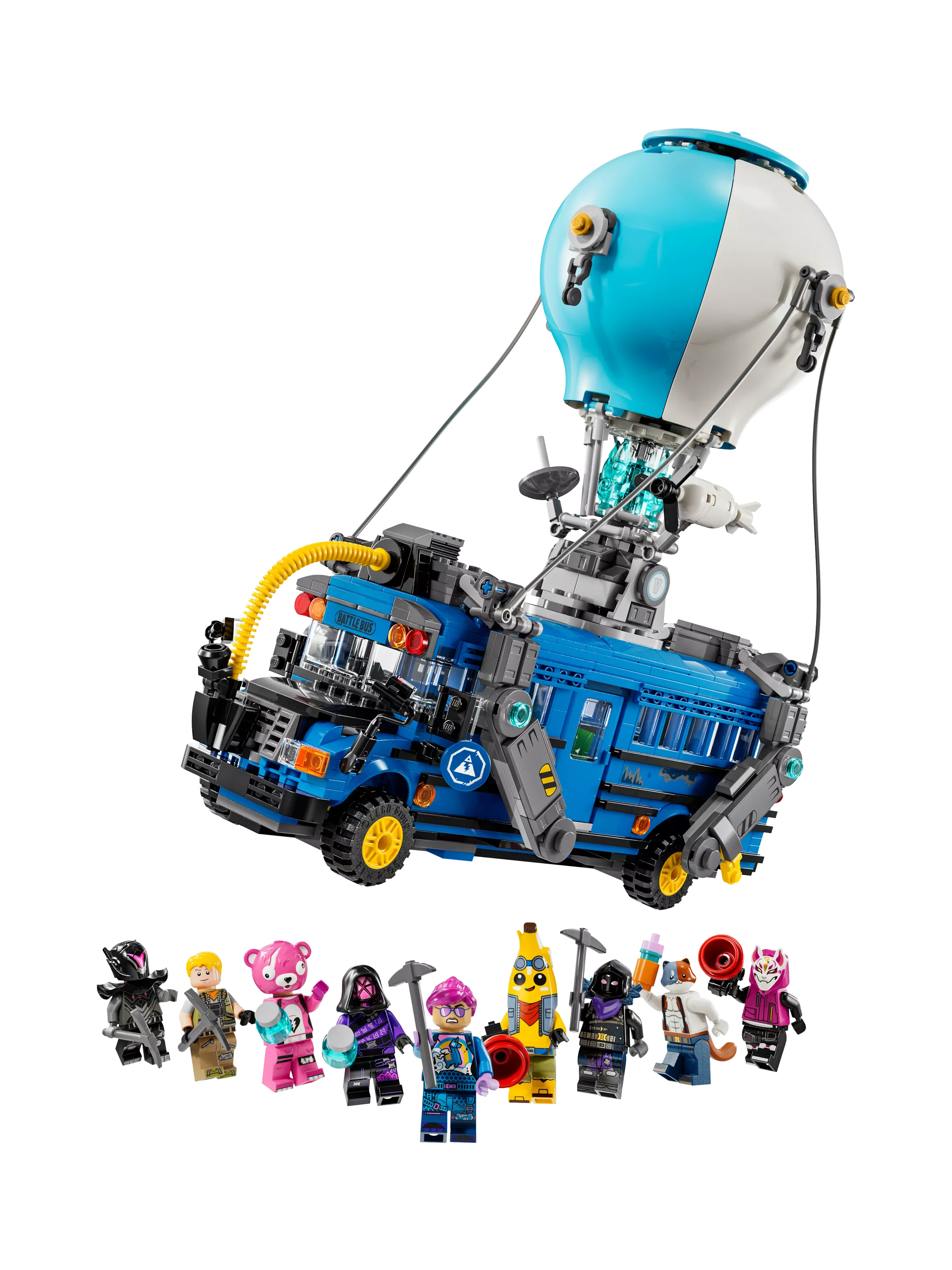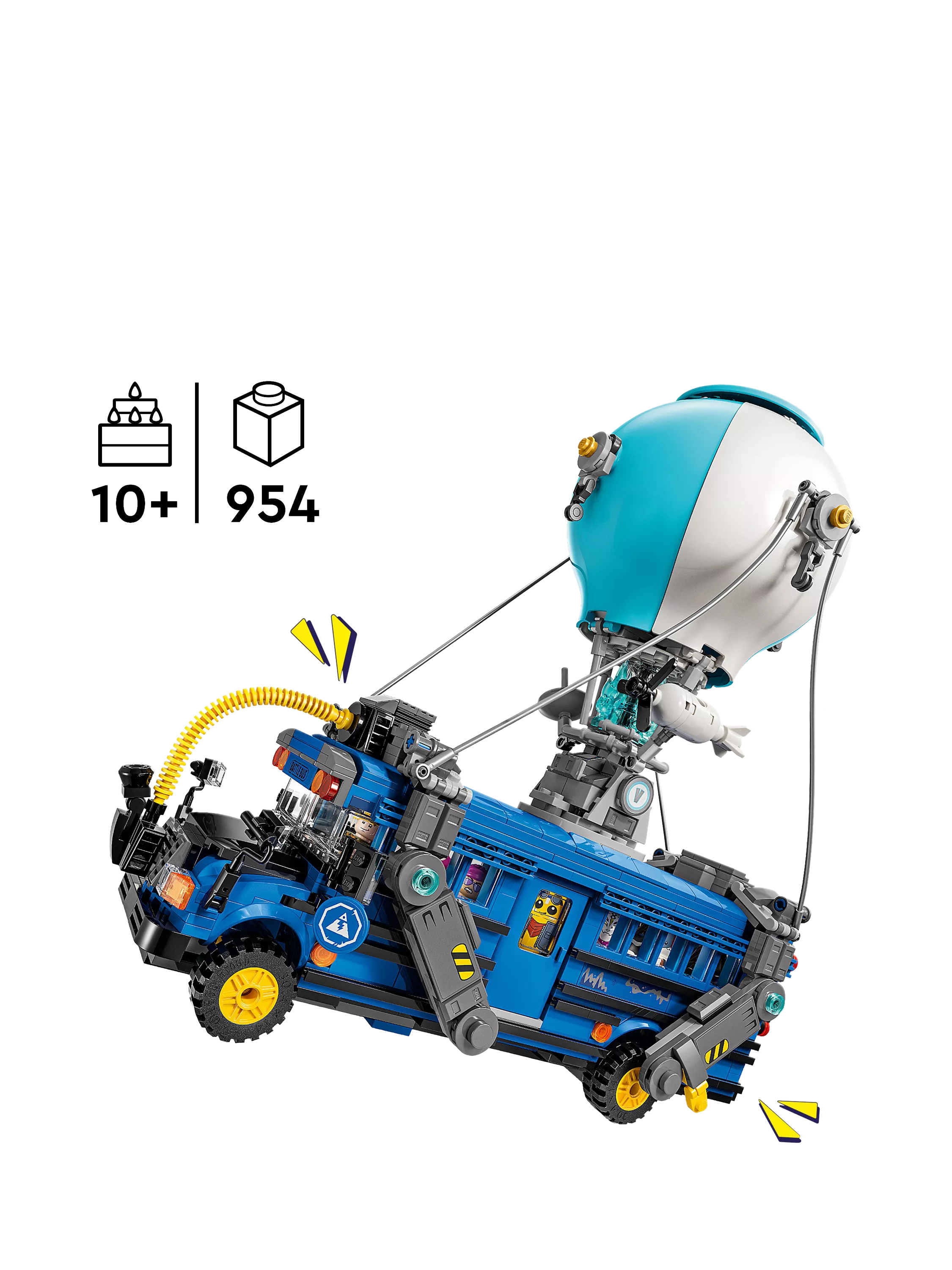 "An officially licensed Fortnite Battle Bus built in premium LEGO detail—954 bricks, fully displayable with a transformable hot-air balloon canopy, removable roof, working wheels, and nine authentic minifigure-scale figures for immersive play and museum-worthy display."