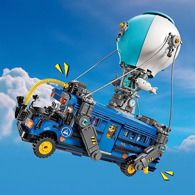 A Fortnite-themed LEGO set featuring a transformable Battle Bus with a hot-air balloon canopy, wheels, and removable roof. Includes nine Fortnite minifigure-scale characters and a variety of accessories like Slurp Juice, Grappler tools, Pickaxes, and Slap Juice. The set is designed for display and role-play, suitable for ages 10 and up. Dimensions are approximately 11 x 11 x 5 inches. Made from high-quality LEGO bricks.