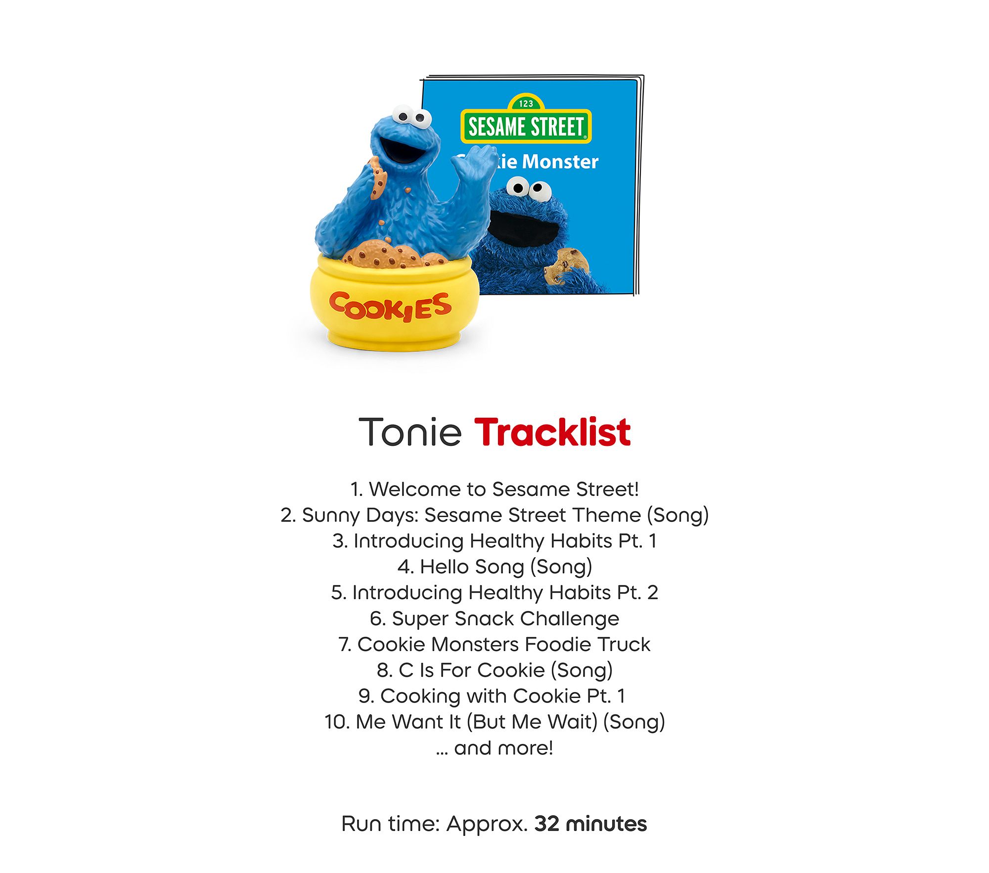 "Three beloved Sesame Street Tonies in one pack that spark curiosity and imaginative play for ages 3+, fueling independent listening with 103 minutes of songs and stories."